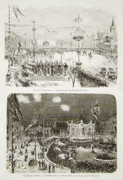 Insieme di due vedute raffiguranti le feste tenutesi a Ravenna, in occasione dell'inaugurazione del monumento al patriotta Carlo Farini. Testo al retro
