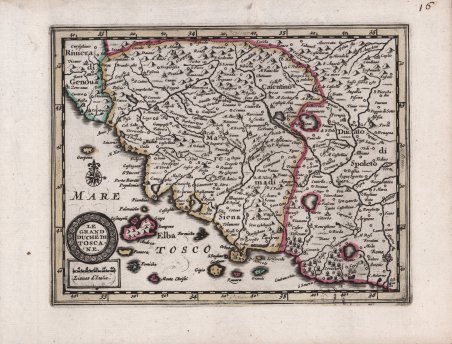 Rarissima mappa tratta dal "Nouveau Petit Atlas - Atlas soluagé de son gros pesant Fardeau" stampato a Leida, nel circa 1714. L’atlante è incredibilmente raro e solo una copia completa è conosciuta nella biblioteca di Leida, mentre Burden possiede solo il primo volume. è composto di nove parti: una parte generale denominata “Nouveau Petit Atlas” e 8 parti con mappe regionali intitolate “Atlas Soulage de son gros e pesant Fardeau”. Quasi tutte le mappe vengono stampate utilizzando e rielaborando le lastre di Janssonius per il suo “Atlas Minor”, atlante di ispirazione mercatoriana che prima Jodocus Hondius jr. e Pieter Kaerius, ' poi Johannes Janssonius ampliarono e aggiornarono. I titoli e la scala sono stati tradotti in francese. I cartigli sono stati modernizzati, con una forma tonda od ovale composta e delle rose dei venti aggiunte. Alcuni toponimi sono aggiunti, come si nota dalla diversa grafia incisa. Le carte dell’Italia provengono dall’ottava ed ultima parte dell’atlante, denominata “L’Atlas Soulagé de son gros & pesant fardeu: Ou ' NOUVELLES CARTES GEOGRAPHIQUES ' qui contiennent ' l’ITALIE, ' avec le Paryies principales qui la composent comme l’Etat del L’eglise, Naples, Sicile, &c. Ouvage propre pour Vouager commodement & agréablement des Yeux”. Acquaforte, con coloritura coeva, in ottime condizioni. Grandissima rarità cartografica. Very rare map from the "Nouveau Petit Atlas - Atlas soluagé de son gros pesant Fardeau" printed in Leiden, circa 1714. The atlas is incredibly rare and only one complete copy is known in the Leiden library, while Burden owns only the first volume. it consists of nine parts: a general part called "Nouveau Petit Atlas" and 8 parts with regional maps entitled "Atlas Soulage de son gros e pesant Fardeau". Almost all of the maps are printed using and reworking Janssonius' plates for his "Atlas Minor", a Mercatorian-inspired atlas that first Jodocus Hondius Jr. and Pieter Kaerius, then Johannes Janssonius expanded and updated. The titles and scale have been translated into French. The cartouches were modernized, with a compound round or oval shape and wind roses added. Some place names are added, as noted by the different engraved spelling. The maps of Italy come from the eighth and last part of the atlas, called "L'Atlas Soulagé de son gros & pesant fardeu: Ou NOUVELLES CARTES GEOGRAPHIQUES qui contiennent l'ITALIE, avec le Paryies principales qui la composent comme l'Etat del L'eglise, Naples, Sicile, &c. Ouvage propre pour Vouager commodement & agréablement des Yeux". Etching, with contemporary coloring, in very good condition. A cartographic rarity. Cfr.