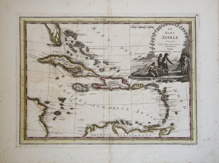 - ' PRIMA EDIZIONE ' – La carta mostra la Florida come un arcipelago di isole allungate che si estende da Palm Beach e culmina con le Florida Keys. Le Antille sono mostrate in dettaglio dalle Bahamas a Trinidad, anche se la proiezione causa un accorciamento da nord a sud. Vengono nominate molte singole isole, città e caratteristiche, tra cui le Isole Cayman. La carta mostra linee tratteggiate che probabilmente rappresentano secche e altre aree di acque poco profonde. Il cartiglio, completamente colorato, sembra rappresentare i negoziati tra i nativi americani e gli europei. Importante e decorativa mappa tratta dal "Nuovo Atlante Geografico Universale delineato sulle ultime osservazioni", edito a Roma dal 1792 fino al 1801, opera che la Calcografia Camerale commissionò al Cassini al fine di sostituire l’ormai obsoleto "Mercurio Geografico". Giovanni Maria Cassini, Chierico Regolare Somasco fu geografo e cartografo, ma anche intagliatore di architetture e prospettive - uno dei migliori discepoli di Giovanni Battista Piranesi - Cassini fu uno degli ultimi sferografi italiani del Settecento ed i suoi globi ebbero una notevole diffusione, come pure questo "Nuovo Atlante Geografico". L'Atlante del Cassini fu ristampato dalla Calcografia Camerale nel primo quarto del XIX secolo, prima del 1839. Solo gli esemplari di prima edizione come questo sono stampati su carta vergata coeva e sono colorati a mano in epoca. Le tirature del XIX secolo sono già su carta meccanica, priva di vergelle, e generalmente in bianco e nero. Acquaforte, coloritura coeva con ritocchi di colore nel cartiglio, in ottimo stato di conservazione. - FIRST EDITION - The map shows Florida as an elongated archipelago of islands extending from Palm Beach and culminating in the Florida Keys. The West Indies are shown in detail from the Bahamas to Trinidad, although the projection causes a shortening from north to south. Many individual islands, cities, and features are named, including the Cayman Islands. The map shows dotted lines that probably represent shoals and other areas of shallow water. The fully colored cartouche appears to represent negotiations between Native Americans and Europeans. The Italian painter and engraver, Giovanni Maria Cassini, produced this attractive map as part of his epic three-volume atlas, the Nuovo atlante geografico universale delineato sulle ultime osservazioni. ' Roma, Calcografia Camerale, 1792-1801. Cassini was geographer and cartographer, but he was also good at engraving architectural items and perspectives – he was one of the best disciples Giovanni Battista Piranesi had. Moreover, Cassini was one of the last artists to engrave spheres in the XVIII century and his globes were quite famous and widespread, and realized the most important Italian Atlas of the XVIII century; his maps always bear a cartouche, extremely rich in colours and details. Cassini's Atlas was reprinted by the Calcografia Camerale in the first quarter of the 19th century, before 1839. Only the first edition examples - such as this one - are printed on contemporary laid paper and are hand-colored. Nineteenth-century editions are already on wove paper, lacking and uncolored. Copperplate with fine original hand colour with addition on the cartouche, in very good condition. Cfr.