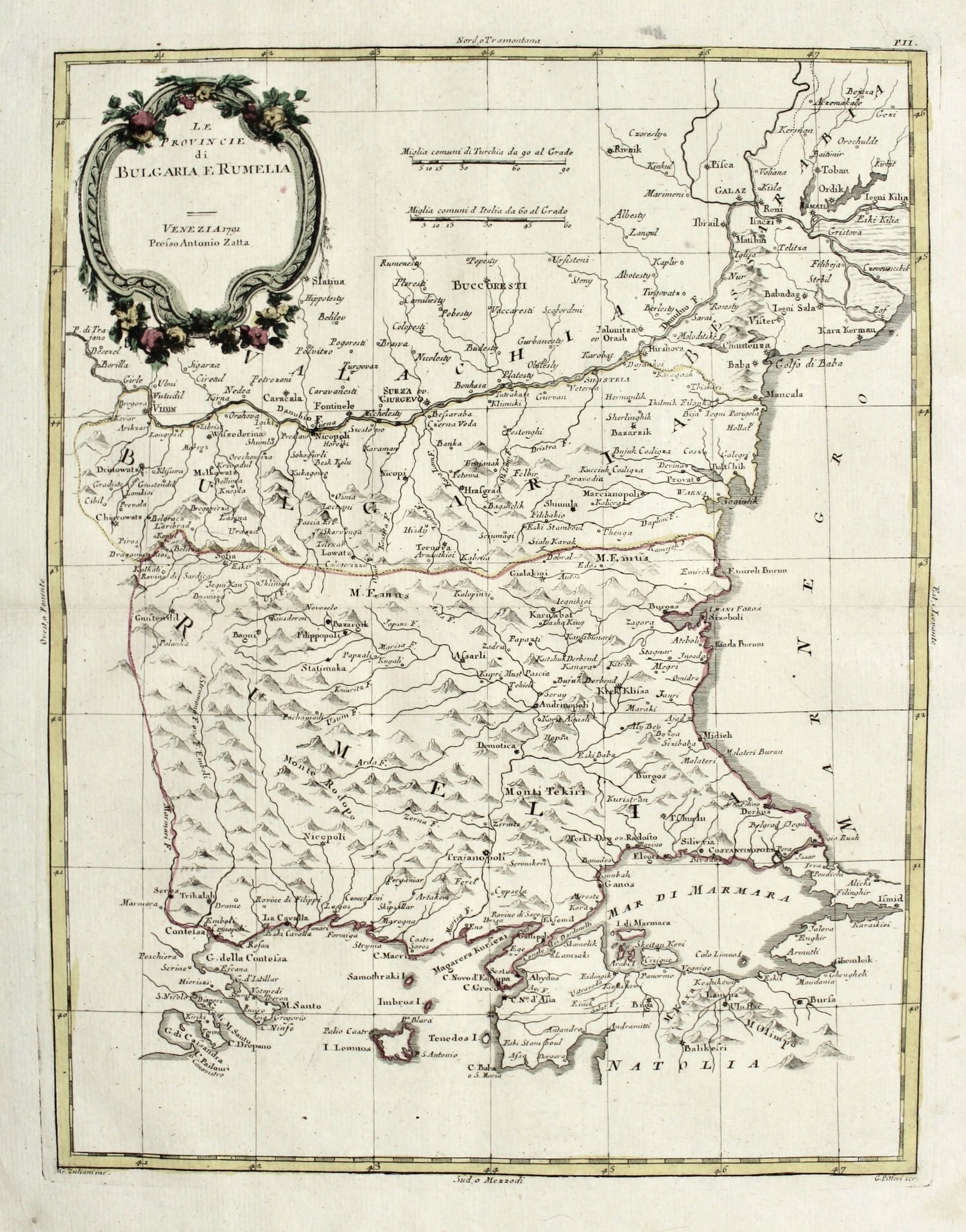 Incisione in rame, mm 408x315; foglio mm 498x386; colorata d'epoca, impressa su carta vergellata e con marca d'acqua. Antonio Zatta (1775-1797) fu uno dei più importanti editori di carte geografiche del tardo XVIII secolo italiano. La sua opera costituisce un importante punto di passaggio tra la cartografia antica e moderna, più attenta all'accuratezza dei dettagli geografici che all'abbellimento estetico ricco di motivi mitologici o d'invenzione, come era quello dell'epoca precedente. La sua opera più importante è Atlante novissimo pubblicato tra il 1775 e il 1789.<BR>I disegni delle illustrazioni furono curate da collaboratori quali Giovanni Marco Pitteri, Anton Friedrich Busching, Pietro Antonio Novelli, ed incise da Giuliano Zuliani. Ottimo esemplare a pieni margini. <BR>Copperplate engraving, mm 408x315; sheet mm 498x386; contemporary coloring, printed on laid paper with water mark. Antonio Zatta (1775-1797) was one of the most important map publishers of late 18th-century Italy. His work constitutes an important transition point between ancient and modern cartography, which was more concerned with the accuracy of geographic detail than with aesthetic embellishment rich in mythological motifs or invention, as was the case in the earlier period. His most important work is Atlante novissimo published between 1775 and 1789.<BR>The drawings of the illustrations were edited by collaborators such as Giovanni Marco Pitteri, Anton Friedrich Busching, Pietro Antonio Novelli, and engraved by Giuliano Zuliani. Very good copy with full margins.<BR>