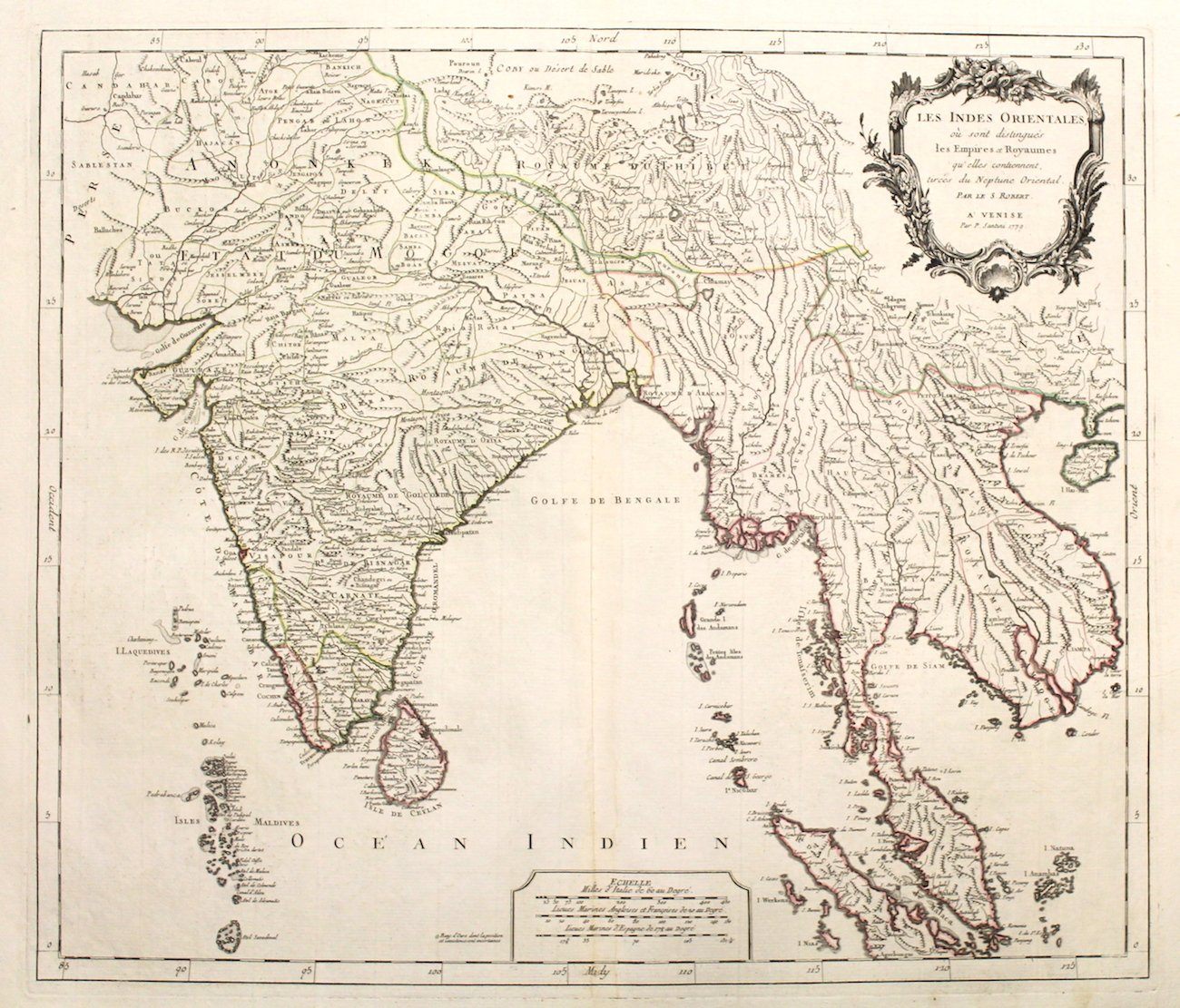 Incisione in rame, colorata d'epoca ai confini, mm 488x577. Edizione veneziana della carta di De Vaugondy tratta da "Atlas Universel" stampato a Venezia fra il 1776 ed il 1784. Esemplare ottimo con minimi difetti marginali. Copperplate, original outline color, 488x577. Venitian edition of De Vaugondy's. From "Atlas universel" printed in 1776-84. Good example with minor folds in top margin and a small lack of paper in bottom margin.