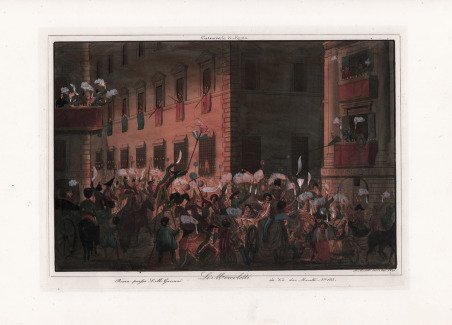 Veduta raffigurante la festa di Carnevale, in via del Corso a Roma. Firmata in basso a destra St. Morelli inv. e inc. 1843; sotto troviamo i dati editoriali, Roma presso L. M. Garroni in Via due Macelli N. 103. ' L’opera è relativa all'ultimo giorno di Carnevale, il martedì grasso, c'è la "festa dei moccoletti", riprodotta da moltissimi artisti. Ognuno esce da casa in maschera e con un moccolo (un lumino, una fiaccola o anche una lanterna), e un fiume di luci inonda le strade, in particolare il Corso. Funziona così: bisogna spegnere il moccoletto a una persona di sesso opposto, conservando acceso il proprio; chi ha il moccoletto spento deve togliersi la maschera. E tra la folla, protetta dalle maschere, accade di tutto: scherzi crudeli, furti, accoltellamenti, tradimenti coniugali. Con l'arrivo dell'alba tutto svanisce: è il mercoledì delle ceneri, il primo giorno della Quaresima. Il Museo di Roma possiede altre due lastre di Stanislao Morelli sul Carnevale romano: Carrozze a via del Corso per il Carnevale e Maschere e carrozze a via del Corso, entrambe del 1843. All’Istituto Centrale per la Grafica troviamo la matrice della Corsa de’ Barberi, sempre della stessa serie. ' Acquaforte, con magnifica coloritura coeva, in perfetto stato di conservazione. Opera rarissima. Veduta raffigurante la festa di Carnevale, in via del Corso a Roma. Firmata in basso a destra ' St. Morelli inv. e inc. 1843; sotto troviamo i dati editoriali, Roma ' presso L. M. Garroni in Via due Macelli N. 103. ' L’opera è relativa all'ultimo giorno di Carnevale, il martedì grasso, c'è la "festa dei moccoletti", riprodotta da moltissimi artisti. Ognuno esce da casa in maschera e con un moccolo (un lumino, una fiaccola o anche una lanterna), e un fiume di luci inonda le strade, in particolare il Corso. Funziona così: bisogna spegnere il moccoletto a una persona di sesso opposto, conservando acceso il proprio; chi ha il moccoletto spento deve togliersi la maschera. E tra la folla, protetta dalle maschere, accade di tutto: scherzi crudeli, furti, accoltellamenti, tradimenti coniugali. Con l'arrivo dell'alba tutto svanisce: è il mercoledì delle ceneri, il primo giorno della Quaresima. Il Museo di Roma possiede altre due lastre di Stanislao Morelli sul Carnevale romano: ' Carrozze a via del Corso per il Carnevale ' e ' Maschere e carrozze a via del Corso, entrambe del 1843. All’Istituto Centrale per la Grafica troviamo la matrice della Corsa de’ Barberi, sempre della stessa serie. ' Acquaforte, con magnifica coloritura coeva, in perfetto stato di conservazione. Opera rarissima. Cfr.