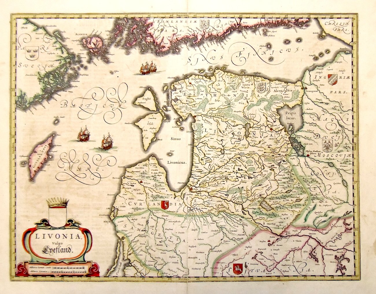 Incisione in rame, coloritura originale d'epoca, mm 383x499. Bella carta di Estonia, Lettonia e Lituania settentrionale. W. Blaeu, astronomo allievo di Tycho Brahe, fondò un'officina per la costruzione di globi nel 1599; quasi immediatamente iniziò a pubblicare anche carte geografiche, giungendo nel 1630 alla creazione del primo atlante "Atlantis Appendix" e cinque anni dopo, della prima edizione in due tomi del "Atlas Novus". Dopo la sua morte nel 1638, a cura del figlio Johan si giunse nel 1662 alla pubblicazione del celebre "Atlas Maior" in 11 volumi. Nel 1672 un incendio distrusse l'officina e segnò la fine dell'attività. Buon esemplare con restauri alla piega centrale in alto ed in basso, ampi margini. <BR>Copper engraving, original colour, mm 383x499. Map of Estonia, Latvia and northern part of Lithuania. Very good condition except minor restoration at centerfold. W. Blaeu, born in Alkmaar in 1571, studied astronomy by Tycho Brahe and founded a business in 1599 as a globe and instrument maker. He immediately expanded the business publishing maps and in 1630 the first atlas "Atlantis appendix" and five years later the "Atlas novus". After his death in 1638, his son Joan reached publication of the major work of the family, the "Atlas maior" in 11 volumes. in 1672 a great fire destroyed the Blaeu's printing house. <BR><BR>