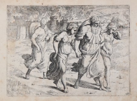 Acquaforte, circa 1607, firmata in lastra. Bellissima prova, con pieni margini, alcuni strappi nei margini bianchi dove sono presenti delle leggere gore d’acqua che non intaccano la parte incisa, per il resto in buono stato di conservazione. La tavola appartiene alla famosa Bibbia di Raffaello, incisa da Sisto Badalocchio e Giovanni Lanfranco, dal titolo Historia del Testamento Vecchio dipinta in Roma nel Vaticano da Raffaello da Urbino et intagliata in rame da Sisto Badalocchi et Giovanni Lanfranchi Parmigian. Al Sig. Annibale Carracci. In Roma appresso a Giovanni Orlandi. Con licenza de' Superiori. 1607. La serie fu realizzata intorno al 1607 a Roma, dove i due artisti erano allievi di Annibale Carracci; 28 delle tavole sono incise da Lanfranco, 23 da Badalocchio. Le opere derivano dagli affreschi di Raffaello nella loggia del Vaticano. Scrive Michael Bury in The Print in Italy, BM 2001, cat.90: “The etchings reverse Raphael's compositions. Mussini noted a tendency to simplification and alteration, especially in Badalocchio (Mussini, 1979, p.61); Borea suggested that the prints are the result of some critical reflection (1986, p.xvi). In the plate shown here, the spatial structure is substantially altered by cutting the height of the scene, making Isaac's head almost touch the top edge. This is in line with what is done in many others, by Sisto Badalocchio as well as Lanfranco. The effect is to increase the size and impact of the figures, for it is their movements and their relationships with one another that are at the centre of attention. The long dedication to Annibale Carracci reveals that the drawings had been made during the previous summer, while the Pope was away from the Vatican. Annibale's illness had prevented Badalocchio and Lanfranco from studying with him, and, keen to pursue their studies during this period, they had turned to the work of Raphael, whom Annibale always praised so much. They had now decided to publish their drawings for the benefit of young students of painting who live far away, executing them in etching 'for greater speed' ("per maggiore prestezza"). It is pointed out that not everyone has appreciated the Loggie frescoes as much as they deserve, believing them to have only been designed by Raphael; however for the variety of the inventions and for their sublime subjects they are worthy of the highest regard. Ginzburg Carignani (1996, p.130 and n.112) has shown that the preface was not in fact written by the two pupils, but by G.B.Agucchi (1570-1632) the patron and writer on art. Agucchi was a great champion of the Carracci and of Annibale in particular, seeing them as the reformers who had restored painting to the true path marked out first by the ancients and then, in modern times, by Raphael”. Plate of the Raphael Bible etched by Badalocchio and Lanfranco, titled Historia del Testamento Vecchio dipinta in Roma nel Vaticano da Raffaello da Urbino et intagliata in rame da Sisto Badalocchi et Giovanni Lanfranchi Parmigian. Al Sig. Annibale Carracci. In Roma appresso a Giovanni Orlandi. Con licenza de' Superiori. 1607. The series consists of 54 plates, a frontispiece and three etched plates with dedicatory text to Annibale Carracci and 50 plates after Raphael that are numbered from 5 to 54. The set was made when the two etchers were both young pupils of Carracci in Rome in 1607 and were said to have been made to try to lift him out of depression; 28 plates are by Lanfranco (Bartsch XVIII.345.1 to 28) and 23 (including the frontispiece) by Badalocchio (Bartsch XVIII.354.1 to 23). From Michael Bury, The Print in Italy, BM 2001, cat.90: “The etchings reverse Raphael's compositions. Mussini noted a tendency to simplification and alteration, especially in Badalocchio (Mussini, 1979, p.61); Borea suggested that the prints are the result of some critical reflection (1986, p.xvi). In the plate shown here, the spatial structure is substantially altered by cutting the height of the scene, making Isaac's head almost touch the top edge. This is in line with what is done in many others, by Sisto Badalocchio as well as Lanfranco. The effect is to increase the size and impact of the figures, for it is their movements and their relationships with one another that are at the centre of attention. The long dedication to Annibale Carracci reveals that the drawings had been made during the previous summer, while the Pope was away from the Vatican. Annibale's illness had prevented Badalocchio and Lanfranco from studying with him, and, keen to pursue their studies during this period, they had turned to the work of Raphael, whom Annibale always praised so much. They had now decided to publish their drawings for the benefit of young students of painting who live far away, executing them in etching 'for greater speed' ("per maggiore prestezza"). It is pointed out that not everyone has appreciated the Loggie frescoes as much as they deserve, believing them to have only been designed by Raphael; however for the variety of the inventions and for their sublime subjects they are worthy of the highest regard. Ginzburg Carignani (1996, p.130 and n.112) has shown that the preface was not in fact written by the two pupils, but by G.B.Agucchi (1570-1632) the patron and writer on art. Agucchi was a great champion of the Carracci and of Annibale in particular, seeing them as the reformers who had restored painting to the true path marked out first by the ancients and then, in modern times, by Raphael. Etching, printed on contemporary laid paper, with full margins showing tears at waterstains, otherwise good condition. Cfr. TIB.40.10