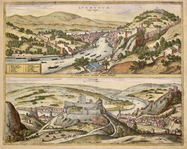 Incisione in rame, mm 370x470, colorata a mano. Due riquadri con vedute delle città francesi di Lione e Vienne. <BR>Tratta da "Civitates Orbis Terrarum", pietra miliare del vedutismo, pubblicata in anni differenti dal 1572 al 1615 ca. in 6 volumi. Bell'esemplare, su carta uniformemente brunita, con leggere mende marginali e qualche traccia di sporco superficiale. <BR>