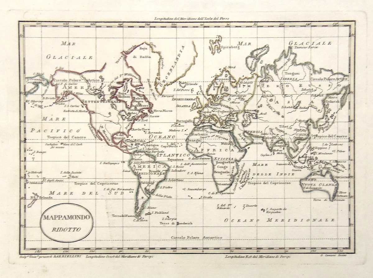 Incisione in rame, mm 178x250, colorata d'epoca ai confini. Incisa da G. Caniani e tratta da "Geografia Universale". Piacevole piccolo mappamondo ricavato in proiezione mercatoriana. <BR>Ottimo esemplare con piega in alto e tracce di ossidazione <BR>Copper engraving, mm 178x250, original outline color. Small world map in Mercator's projection. By G. Caniani, from "Geografia Universale" <BR>
