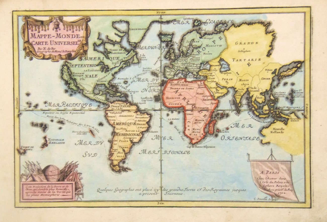 Set of world and continents (6 maps): Copper engravings by C. Inselin, each mm 232x330, full modern wash color. Attractive and decorative medium sized set with two world maps, one double hemisphere and one in Mercator’s projection. Nicolas de Fer (1646-1720) was a leading frech engraver and cartographer, official geographer of the king of France. The map of America id dated 1702. Good condition.