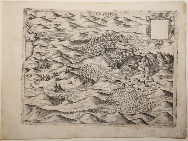 Mappa della città di Margariti, in Epiro, che fu espugnata dai Veneziani nel 1571.Rara tavola parte del celebre "Isole Famose" di Camocio. Tra il 1560 ed 1575 Camocio pubblicò circa quaranta carte di grande formato e molte furono le carte di piccolo formato pubblicate sciolte tra il 1566 e il 1574, che andarono successivamente a formare il volume noto col nome "Isole famose, porti, fortezze e terre marittime sottoposte alla Serenissima Signoria di Venetia, ed altri Principi Christiani, et al Signor Turco, nouamente poste in luce. In Venetia alla libreria del segno di San Marco". Le carte inserite nell’isolario di Camocio hanno la lastra ritoccata e un numero sequenziale aggiunto, mentre le prime prove sono caratterizzate dalla grande qualità di stampa e dall’assenza del numero. Gli esemplari con la numerazione sono, invece, quelli inseriti nelle edizioni dell'isolario edite da Donato Bertelli - imprint In Venetia alla libreria del segno di San Marco. Tale edizione, sebbene priva di data, risale a dopo il 1575, anno in cui il Camocio scomparve durante l'epidemia di pestilenza a Venezia e gran parte della sua tipogrfaia fu acquisita dal Bertelli.Raro primo stato, avanti la numerazione. Acquaforte e bulino, in buono stato di conservazione.Bibliografia: S. Bifolco, Città e Fortezze Principali del Mondo, in Bifolco-Ronca "Cartografia e Topografia Italiana del XVI secolo. Catalogo ragionato delle opere a stampa" (2018), pp. 126, 140-141. THE RARE FIRST STATE. Plan of Margariti in Epirus, showing the fortress under siege by the Venetians in 1571, shortly before the Battle of Lepanto.From Camocio's "Isole Famose".This work, as was usual for Camocio and his other contemporary publishers, was on the market as loose map and later included in the "Isole famose, porti, fortezze e terre marittime sottoposte alla Serenissima Signoria di Venetia, ed altri Principi Christiani, et al Signor Turco, nouamente poste in luce. In Venetia alla libreria del segno di San Marco". The issue with the numbers are, instead, those inserted in the editions of the book published by Donato Bertelli - showing the imprint In Venetia alla libreria del segno di San Marco. This edition, although without date, dates back to after 1575, the year in which the Camocio disappeared during the pestilence epidemic in Venice and much of its typography was acquired by Bertelli.Etching with engraving, in good condition.Bibliografia: S. Bifolco, Città e Fortezze Principali del Mondo, in Bifolco-Ronca "Cartografia e Topografia Italiana del XVI secolo. Catalogo ragionato delle opere a stampa" (2018), pp. 126, 140-141. Cfr. Gallo (1950): p. 97, n. 29; Tolias (2011): n. 0378; Zacharakis (2016): n. 804a.