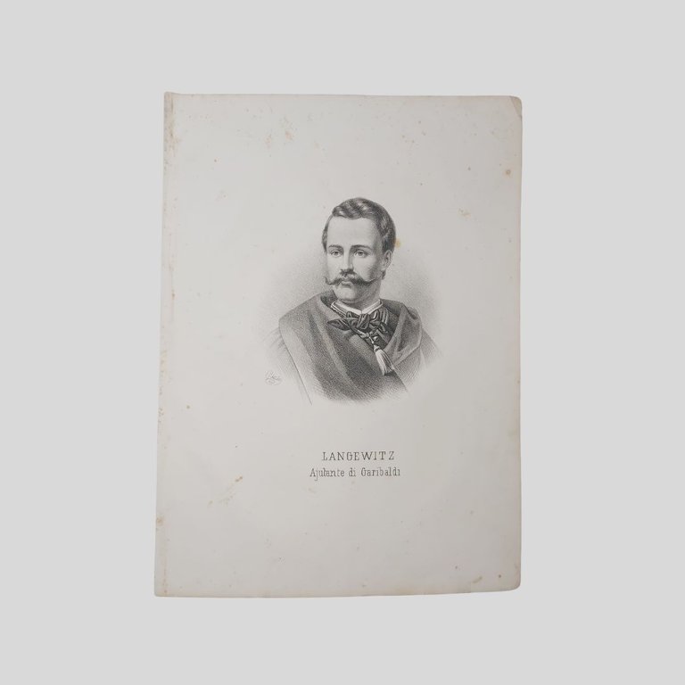 Litografia originale su carta di Gaetano Riccio, tratta da Domenico Valente, Storia della guerra di Sicilia, Napoli, 1862. Tavola sciolta, cm 35×25. Naturali tracce d’uso, qualche fioritura, con segni di piegatura. Litografia originale raffigurante Mariano Langewitz aiutante di Giuseppe Garibaldi. La tavola è tratta dall’opera di Domenico Valente, Storia dell’Italia centrale dopo la pace di Zurigo e della guerra di Sicilia e dei fatti posteriori, Napoli, A. Morelli, 1862. Una delle più importanti testimonianze iconografiche e narrative degli eventi legati alla spedizione dei Mille e alla successiva integrazione della Sicilia nel Regno d’Italia. Il ritratto, realizzato secondo il gusto ottocentesco, restituisce un’immagine ufficiale e celebrativa del personaggio, sottolineandone il ruolo istituzionale, militare o politico all’interno del processo risorgimentale. Si tratta di una stampa originale dell’epoca, non di una riproduzione moderna, destinata in origine alla consultazione e alla divulgazione storica, oggi apprezzata come documento collezionistico e iconografico. Esemplare di sicuro interesse per collezionisti di Risorgimento italiano, storia militare, iconografia ottocentesca e per studiosi del processo di unificazione nazionale.