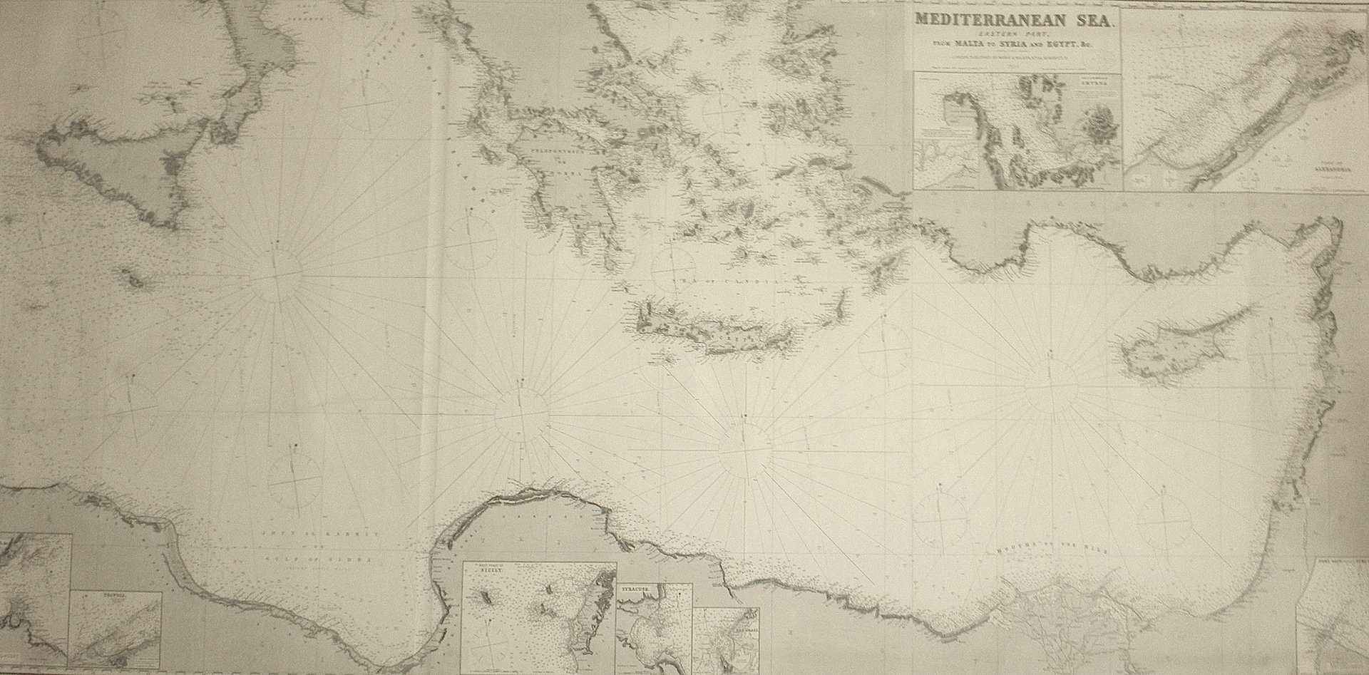 Western part, from Gibraltar to Malta & c. (insieme a:) Eastern part. From Malta to Syria and Egypt.<BR>Due grandi carte incise in rame, ognuna in tre fogli, per complessivi cm 100x210; arricchite da 33 riquadri di varia misura raffiguranti porti e golfi, fra cui Gibilterra, Barcellona, Palma de Mallorca, Marsiglia, Genova, Golfo di Napoli, Stretto di Messina, Mahon, Valletta, Bonifacio, Smirne, Alessandria, le Egadi e Tripoli.<BR>Le carte sono disegnate e compilate da J.W. Appleton e incise da Homewood & Son. Complessivamente in ottimo stato sebbene, considerata la grandezza, vi siano alcuni consueti strappi restaurati quasi sempre di minima entità tranne due nel Mediterraneo Orientale. Norie e Wilson continuarono l'attività dell'azienda fondata da Charles Wilson e furono specializzati in carte nautiche caratterizzate per essere montate su fondo di supporto blu, appunto le celebri "blue-back' sea-charts", lavorando per l'Ammiragliato e la East India Company. Ovviamente montata editorialmente su tale supporto con etichetta aziendale. Molto rare soprattutto in ottimo stato e complete. <BR>Two big nautical charts, each in three sheets joined for total cm 100x210 with 33 inset maps of major towns and harbours and ports: Gibraltar, Barcelona, Palma de Mallorca, Marseille, Genua, Gulf of Naples, Strait of Messina, Mahon, Valletta, Bonifacio, Smyrne, Alexandria, Egadi island and Tripoli of Lybia. The charts are drawn and compiled by J.W. Appleton and engraved by Homewood and son. In very good general condition