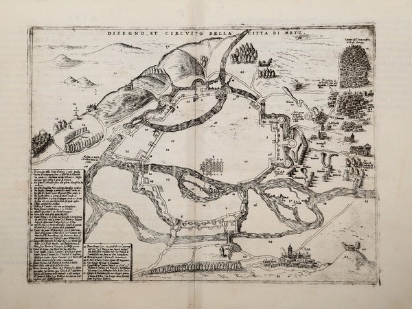 Anonima carta topografica raffigurante l’assedio di Metz, attribuita a Domenico Zenoi.L'opera è parte della celebre raccolta di cartografia urbana che questi pubblica, insieme a Paolo Forlani, nel 1567 con il titolo “Il primo libro delle citta, et fortezze principali del mondo". L’opera è di incredibile rarità e non ebbe una grande fortuna editoriale.Forse perché le lastre furono acquisite dall’editore Bolognino Zaltieri, che le utilizza per la raccolta di cartografia urbana realizzata da Giulio Ballino, denominata "De’ disegni delle più illustri città e fortezze del mondo", edita sempre a Venezia solo due anni dopo, nel 1569.Giulio Ballino era un avvocato veneziano che frequentava la casa dei Manunzio già verso il 1530, dedicandosi in gioventù allo studio dei classici. Il libro “De’ disegni delle più illustri città, et fortezze del mondo”, stampato da Bolognino Zaltieri, è costituito da cinquanta vedute ed una carta geografica. L’opera rappresenta il primo tentativo, nell’ambito dell’editoria italiana, della realizzazione di un testo/atlante delle principali fortezze e città del mondo. A differenza dei suoi predecessori, dei quali utilizza spesso i rami e le iconografie, egli concepisce un’opera unitaria corredata di testi e di indice, della quale, per la prima volta, si è ha conoscenza dell’esatto numero di tavole che la compongono. Sicuramente ispirata all’opera del Du Pinet Plantz, "Pourtraitz et descriptions de plusieurs ville set forteresses.", la raccolta del Ballino è molto probabilmente solo una parte del progetto iniziale, molto più ampio. Egli probabilmente intendeva pubblicare un’edizione in latino, sperando di lanciare la sua opera a livello europeo, ma si arrese davanti alla pubblicazione del primo libro del "Civitates Orbis Terrarum" di Georg Braun & Fransz Hogenberg, che in qualche modo bruciò parecchie delle iniziative editoriali sull’iconografia urbana.Le carte della raccolta sono datate tra il 1566 ed il 1568; secondo un recente studio di Albert Ganado (1993), trentadue di queste risultano essere ristampe dei rami di Paolo Forlani e di Domenico Zenoi, per la prima volta apparsi ne "Il primo libro delle città, et fortezze principali del mondo del Forlani" (1567); questo cospicuo gruppo di tavole è inserito nella raccolta con alcuni ritocchi nelle lastre, che vengono modificate. Altre furono per la prima volta pubblicate da Ferrando Bertelli nel Disegni di alcune più illustri città di fortezze del mondo con aggiunte di alcune isole principali, datato 1568. Il resto delle tavole sono di anonimi incisori di cui l’autore si servì per la sua opera, probabilmente anche per ritoccare le lastre di cui era già in possesso.Alcuni esemplari di questa rara opera recano il frontespizio allegorico inciso da Nicolò Nelli, famoso incisore e calcografo veneziano della seconda metà del ‘500; altri esemplari viceversa hanno un frontespizio non inciso. Entrambe le versioni sono edite dallo Zaltieri nel 1569. Difficile stabilire quale sia la prima stesura e quale quella successiva, la sola differenza è infatti notabile nel testo al verso delle carte, che può variare nella dimensione dei caratteri. Altra differenza che alcune carte sono numerate al verso, mentre le stesse, esaminate in altri esemplari, sono prive di questo numero di pagina. Per semplice deduzione logica possiamo affermare che gli esemplari privi del numero siano antecedenti, teoria tuttavia non del tutto surrogata dall’esame di più esemplari dell’opera.Acquaforte e bulino, con pieni margini, in perfetto stato di conservazione. Unsigned map of the siege of Metz, ascribed to Domenico Zenoi. The map was first published in the incredible rare Paolo Forlani’s town book "“Il primo libro delle citta, et fortezze principali del mondo", published in 1567 with a partnership of Domenico Zenoi. The plates then comes in the hand of the publisher Bolognino Zaltieri and published in the De’ disegni delle più illustri città e fortezze del mondo", by Giulio Ballino, in 1569.Giulio Ballino was a Venetian lawyer, a friend of the Manuzio family, really fond of classical studies. His work is the first attempt, in Italy, to realize an atlas/text of the main fortresses and cities in the world. Unlike his predecessors, from whom he copied the iconography, Ballino wanted to realize a complex work, with text and an index, so that the reader could know immediately how many works were inside the book. Following Du Pinet’s Plantz, Pourtraitz et descriptions de plusieurs ville set forteresses. Ballino’s work is, with all probability, just the first part of an ambitious, bigger project. May be he wanted to publish a Latin edition, hoping to give his book great fame along Europe, but he had to change his mind when Georg Braun & Fransz Hogenberg published their Civitates Orbis Terrarum, which was then the first book to describe urban iconography. Ballino’s plates have been issued between 1566 and 1568; according to Albert Ganado (1993), 32 of these happen to be reprints of Forlani & Zenoi’s branches, already published for the first time in Il primo libro delle città, et fortezze principali del mondo (1567); the plates of these engravings have been afterwards modified. Some of them have been published in Bertelli’s Disegni di alcune più illustri città di fortezze del mondo con aggiunte di alcune isole principali, (1568). Some examples of this rare work bear an allegorical title page, engraved by the Venetian artist Nicolò Nelli, a popular engraver of the XVI century; other examples bear a blank title page. Both versions have been printed by Zaltieri in 1569. It is quite hard to say which is the first version and which the last one, for the only difference is on the text on verso, with bigger letters in one case. Another difference is that some of the maps in one version have numbers on verso. We might say that those examples without numbers have been printed first, but t