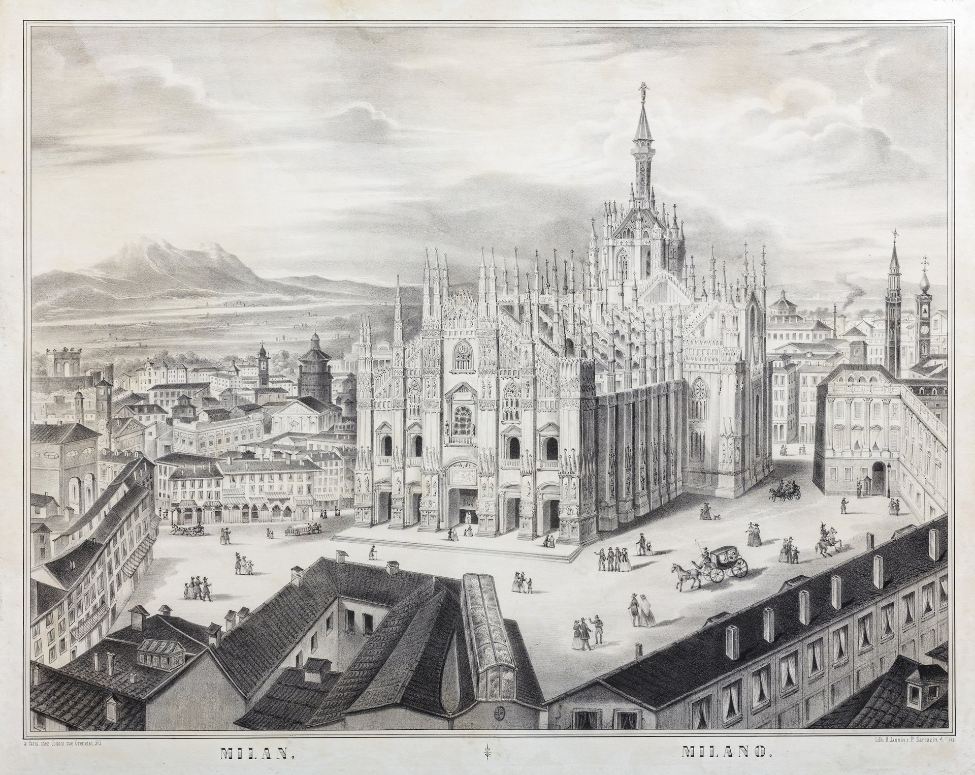 Litografia, mm 485x625 (mm 550x670 il foglio). Bell'esemplare con minimi restauri a forellini e ai margini. Luminosa e panoramica grande veduta della piazza del Duomo con i monti sullo sfondo e scena animata in primo piano.<BR>