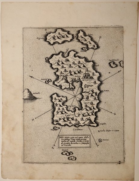 Carta dell'isola di Milos, nell'Egeo.Rara tavola, parte del celebre "Isole Famose" di Camocio.Tra il 1560 ed 1575 Camocio pubblicò circa quaranta carte di grande formato e molte furono le carte di piccolo formato pubblicate sciolte tra il 1566 e il 1574, che andarono successivamente a formare il volume noto col nome "Isole famose, porti, fortezze e terre marittime sottoposte alla Serenissima Signoria di Venetia, ed altri Principi Christiani, et al Signor Turco, nouamente poste in luce. In Venetia alla libreria del segno di San Marco". Le carte inserite nell’isolario di Camocio hanno la lastra ritoccata e un numero sequenziale aggiunto, mentre le prime prove sono caratterizzate dalla grande qualità di stampa e dall’assenza del numero. Gli esemplari con la numerazione sono, invece, quelli inseriti nelle edizioni dell'isolario edite da Donato Bertelli - imprint In Venetia alla libreria del segno di San Marco. Tale edizione, sebbene priva di data, risale a dopo il 1575, anno in cui il Camocio scomparve durante l'epidemia di pestilenza a Venezia e gran parte della sua tipogrfaia fu acquisita dal Bertelli.Raro primo stato, avanti la numerazione. Acquaforte e bulino, in buono stato di conservazione.Bibliografia: S. Bifolco, Città e Fortezze Principali del Mondo, in Bifolco-Ronca "Cartografia e Topografia Italiana del XVI secolo. Catalogo ragionato delle opere a stampa" (2018), pp. 126, 140-141. Rare first state before the number. From Camocio's "Isole Famose".This work, as was usual for Camocio and his other contemporary publishers, was on the market as loose map and later included in the "Isole famose, porti, fortezze e terre marittime sottoposte alla Serenissima Signoria di Venetia, ed altri Principi Christiani, et al Signor Turco, nouamente poste in luce. In Venetia alla libreria del segno di San Marco". The issue with the numbers are, instead, those inserted in the editions of the book published by Donato Bertelli - showing the imprint In Venetia alla libreria del segno di San Marco. This edition, although without date, dates back to after 1575, the year in which the Camocio disappeared during the pestilence epidemic in Venice and much of its typography was acquired by Bertelli.Etching with engraving, in good condition.Bibliografia: S. Bifolco, Città e Fortezze Principali del Mondo, in Bifolco-Ronca "Cartografia e Topografia Italiana del XVI secolo. Catalogo ragionato delle opere a stampa" (2018), pp. 126, 140-141. Cfr. G. Tolias, Mapping Greece, 0394; Zacharakis, A Catalogue of Printed Maps of Greece, 797.