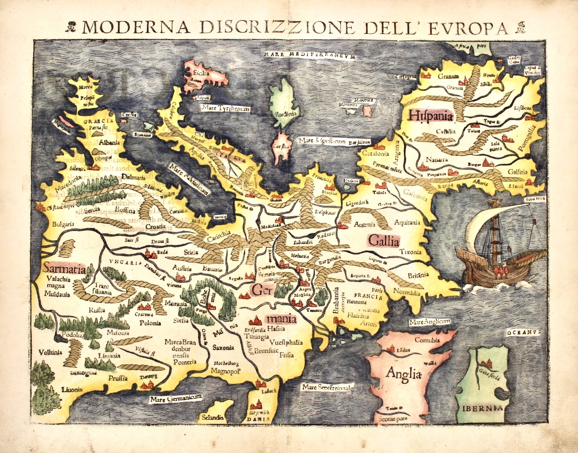 Xilografia, mm 250x340 (foglio mm 310x395), dipinta a mano. Tratta dalla rara edizione italiana della Geographia Universalis, edita nel 1558. <BR>Si tratta di una delle prime mappe del continente europeo. L'insolito orientamento, con il nord in basso della lastra e il Mar Mediterraneo in alto, aggiunge fascino alla mappa. Catene montuose a mucchi di talpa, foreste, una ingenua e semplice idrografia riempiono il territorio con le principali città, unico grande elemento decorativo, un grande veliero nell'Oceano Atlantico.<BR>Sebastian Münster fu il primo a realizzare carte individuali di ogni continente. La carta è stata pubblicata sia nella Geographia che nella Cosmographia Münster. <BR>Münster fu un brillante polimatico e uno dei più importanti intellettuali dell'epoca rinascimentale. Formatosi a Tubinga, i suoi quaderni universitari sopravvissuti, il Kollegienbuch, rivelano una mente dalla curiosità insaziabile, soprattutto per quanto riguarda la cosmografia. In seguito Münster divenne professore di ebraico a Heidelberg e poi, dal 1529, all'Università di Basilea. Negli anni Trenta del Quattrocento si dedicò alla traduzione della Geografia di Tolomeo, aggiungendo nuovo materiale relativo alle nuove terre scoperte in Africa, nelle Americhe e in Asia. Il risultato fu la pubblicazione della sua apprezzata Geographia Universalis, stampata per la prima volta nel 1540. Fu anche un innovatore per quanto riguarda il design e l'impaginazione delle mappe, e fu uno dei primi a creare uno spazio sui suoi blocchi di legno per l'inserimento dei nomi dei luoghi in caratteri metallici. Shirley, The mapping of the world, 92. <BR>Buon esemplare con minimi impercettibili difetti al margine inf. e sup.<BR>