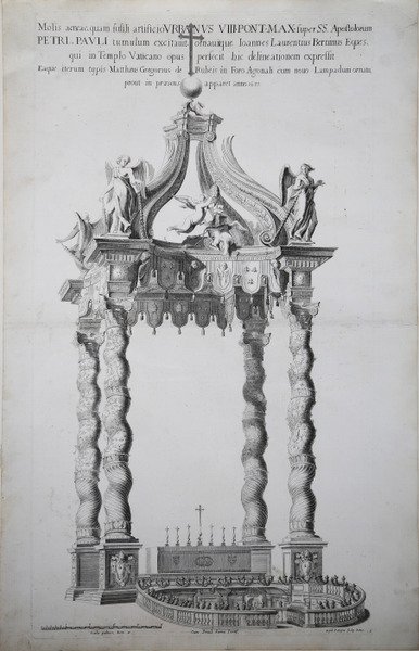 Bulino, 1685, lungo il margine superiore: Molis aeneae, quam fusilli artificio URNABUS VIII PNT MAX super SS Apostolorum/ PETRI PAULI tumulum excitavit, ornavique, Ioannes Laurentius Berninus Eaques/ qui in Templo Vaticano opus perfecit hic delineationem expressit In basso, al centro: Cum Privil. Summi Pontif. ' a destra: Aegid. Patigny Sculp. Roma. Edita e probabilmente incisa da Matteo Gregorio de Rossi, la stampa è una copia di un bulino di Johann Friedrich Greuter pubblicato a Roma dopo il completamento del Baldacchino (Holl. XII, 23a). Bell’esemplare, impresso su carta vergata coeva, filigranata, con margini bianchi. Molto buono lo stato di conservazione. Durante il suo pontificato, Urbano VIII fu criticato per la grandiosità delle opere d'arte che commissionò. Una di queste fu l'enorme altare di San Pietro, alto 30 metri, che Bernini impiegò nove anni per completare (1624-33). Opera spettacolare, anticlassica nella sua veste formale, si riallaccia per molti aspetti alla tradizione. Per non ripetere le tipologie medioevali e rinascimentali del ciborio - composto da una cuspide o cupola marmorea retta da colonne - ed evitare di creare una sorta di tempietto entro un tempio, Bernini si ispirò al baldacchino di tipo processionale, ricercando una soluzione di effetto pittorico piuttosto che architettonico. Le colonne sono suddivise in tre sezioni, l'inferiore con scanalature elicoidali e le due superiori con rami d'ulivo e alloro, popolate da putti, lucertole e api svolazzanti, simbolo dei Barberini, invita l'occhio a spostarsi da una curva all'altra del loro avvolgimento a spirale, favorendo una visione dinamica ed ascendente. Allo stesso tempo, il baldacchino richiama la tradizione antica poiché le colonne ricordano nella forma le colonne a spirale della pergula nella basilica costantiniana, quelle stesse successivamente adattate nelle Logge delle Reliquie. Borromini partecipa nella voluta delle colonne del baldacchino. Matteo Gregorio De Rossi è esponente di uno dei rami della celebre tipografia romana. Verso la fine del XVI secolo inizia l’attività editoriale di Antonio De Rossi, il quale con i figli Giuseppe (il “vecchio”) e Giulio, fonda la stamperia che, nel corso dei due secoli successivi e attraverso quattro generazioni, detenne il monopolio della produzione calcografica della città. La bottega era con insegna De Rossi alla Pace. La storia della famiglia De Rossi è caratterizzata da litigi e contrasti interni che portano all’apertura di singole tipografie in concorrenza tra loro. I figli di Giulio De Rossi, Giuseppe il Giovane e Giovanni Battista, nipoti di Giuseppe De Rossi il Vecchio, avevano fondato nel 1628 una propria bottega sempre nelle vicinanze - All'angolo di via di Parione e via della Pace vicino nei pressi della chiesa S. Biagio della Fossa - ma nel 1635 Giovanni Battista si separò a sua volta dal fratello e aprì una bottega in piazza Navona, la terza quindi della famiglia che venne chiamata a piazza Navona. Nel 1644 dopo la morte di Giuseppe il Giovane suo fratello Giovanni Battista diventò il concorrente più diretto della bottega dello zio, la De Rossi alla Pace, ormai gestita dalla vedova di lui insieme ai figli che allora erano in parte ancora minorenni. Il figlio di Giovanni Battista, Matteo Gregorio De Rossi, proseguì l’attività editoriale paterna, dedicandosi con successo anche all’attività di incisore. Principale collaboratore della tipografia di Giovanni Battista e Matteo Gregorio fu un grande artista del calibro di Lievin Cruyl, che si avvalse della tipografia per la traduzione a stampa di molti suoi disegni su Roma. Matteo Gregorio, in costante rivalità con il cugino Giovanni Giacomo (1627-1691) della tipografia alla Pace, fece intagliare da Tiburzio Vergelli una raccolta sui principali monumenti di Roma ispirata – se non copiata – da Giovan Battista Falda. Engraving, 1685, lettered along top: Molis aeneae, quam fusilli artificio URNABUS VIII PNT MAX super SS Apostolorum/ PETRI PAULI tumulum excitavit, ornavique, Ioannes Laurentius Berninus Eaques/ qui in Templo Vaticano opus perfecit hic delineationem expressit along bottom: Cum Privil. Summi Pontif. ' and Aegid. Patigny Sculp. Roma. Good example, printed on contemporary laid, watermarked, paper. Published and engraved by Matteo Gregorio de Rossi, this work is a copy of an engraving by Johann Friedrich Greuter published in Rome around 1635 (Holl. XII, 23a). “During his pontificate, Urban VIII was criticized for the grandeur of the works of art he commissioned. One of these was the enormous altar of St Peter’s which stands 30 metres high and took Bernini nine years to complete (1624-33). The commission marked the beginning of an association with St Peter's which was to last for over half a century, during which time Bernini was responsible for almost all the major works there (Wittkower 1966, Pp. 17-24; Borsi 1980, pp. 41-60; Lavin 2005). As shown in this print, the Baldacchino design incorporates four enormous Solomonic columns, modelled on those in Old St Peter's. The lower part of each column has helical grooves and the upper sections a relief of olive and bay branches decorated with putti and the Barberini bees. The Barberini coat of arms appear on the pedestal of each column, the sun (another Barberini emblem) on the frieze and more bees on the lappets hanging between. The upper framework is like an open ogival dome supporting the orb and cross. At each corner stands an angel holding a garland from which the canopy is ‘suspended’. Bernini's innovation was to fuse three traditional forms that Lavin regards as 'honorific covering’: the architectural ciborium supported on columns, the processional baldachin carried on staves, and the canopy suspended from above (Lavin 1980, 1, p. 20).” (M. McDonald, The Print Collection of Cassiano dal Pozzo, v.1, 1733, p. 74) Matteo Gregorio De Rossi is an exponent of one of the branches of the famous Roman printing house
