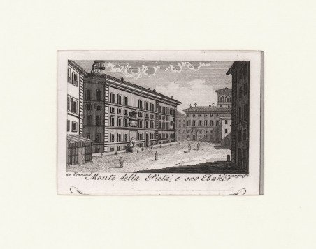 Veduta tratta dalla celebre Raccolta di num. 320 Vedute sì antiche, che moderne della città di Roma. …Incise a bulino in N. 80 rami, In Roma Nella Calcografia di Agapito Franzetti a Torsanguigna Col Permesso. ' L’opera si compone di un frontespizio calcografico e di 80 tavole numerate, ognuna composta da quattro vedute. Viene stampata senza data; molti repertori la datano intorno al 1790 circa, forse perché stampata su carta vergata. Una datazione intorno al 1800 ci sembra tuttavia più plausibile. ' Agapito Franzetti, calcografo attivo a Roma con bottega tra via del Corso e Torsanguigna, è noto per le sue piccole incisioni di veduta che servivano spesso come biglietti da visita. Tutte contengono, infatti, una linea in basso, dove si poteva apporre il proprio nome ad inchiostro. Come indicato nel titolo, le vedute raffigurano sia monumenti e antiche rovine che vedute “moderne”, con piazze, chiese e ville. Ciascuna tavola reca, in basso al centro, il nome dell’incisore. Gli artisti coinvolti sono sei: Jean-Jerome Baugean; Antonio Giuseppe Barbazza; Giovanni Battista Cipriani; Francesco Morelli; Antonio Poretta e Domenico Pronti. Molte delle vedute derivano dalla celebre opera di Giuseppe Vasi, Delle magnificenze di Roma antica e moderna. Pubblicata in 10 volumi dal 1747 al 1761, l’opera presenta 238 incisioni in rame, ciascuna incisione con testo narrativo che fornisce informazioni storiche e documentarie. ' Acquaforte, in buono stato di conservazione. ' Bibliografia: A. Bertarelli, H. Prior, Il biglietto da visita italiano. Contributo alla storia del costume e dell'incisione nel secolo XVII, Bergamo 1911, p. 162. View of the city printed in Rome by the publisher Agapito Franzetti. Taken from Raccolta di num. 320 Vedute sì antiche, che moderne della città di Roma. …Incise a bulino in N. 80 rami, In Roma Nella Calcografia di Agapito Franzetti a Torsanguigna Col Permesso. ' The work consists of an intaglio frontispiece and 80 numbered plates, each consisting of four views. It is printed without date; many repertories date it around 1790, perhaps because it was printed on laid paper. A date around 1800 seems more plausible. Franzetti, a chalcographer working in Rome with a workshop between Via del Corso and Torsanguigna, is known for his small engravings of views that were often used as business cards. They all contain a line at the bottom where one's name could be written in ink. The small views were often printed four to a sheet. As indicated in the title, the views depict both monuments and ancient ruins and "modern" views, with squares, churches and villas. Each table bears, at the bottom center, the name of the engraver. There are six artists involved: Jean-Jerome Baugean; Antonio Giuseppe Barbazza; Giovanni Battista Cipriani; Francesco Morelli; Antonio Poretta and Domenico Pronti. ' The views are made after Giuseppe Vasi’s monumental work Delle magnificenze di Roma antica e moderna. Published in 10 volumes from 1747 to 1761, the work features 238 copper engravings, each engraving with a narrative text that provides historical and documentary information. ' Bibliografia: A. Bertarelli, H. Prior, Il biglietto da visita italiano. Contributo alla storia del costume e dell'incisione nel secolo XVII, Bergamo 1911, p. 162. Cfr.