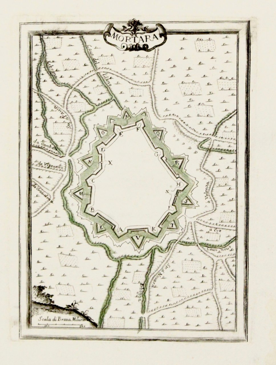 Incisione in rame, colorata d'epoca, 196x150. Raro esemplare con coloritura coeva. Corredata del foglio di testo con una breve storia cittadina su un lato e la legenda entro bella cornice barocca sul verso del foglio. Tratta da "Piante delle città, piazze e castelli fortificati.dello Stato di Milano". Bell' esemplare con lievi tracce di sporco superficiale.