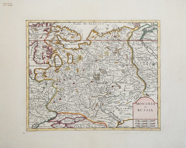 Mappa dettagliata della Russia, che si estende dal Mar Baltico al Mar Nero e ad est fino alla parte occidentale della Siberia. Carta geografica pubblicata a Venezia da Giambattista Albrizzi. Le carte di Albrizzi, derivanti dalle opere di Guillaulme de L’Isle, Iasaak Tirion, furono preparate per il suo Atlante Novissimo, che contiene tutte le parti del mondo del 1740 (volume 1) - 1750 (volume 2). Per le carte italiane l’Albrizzi utilizzò invece fonti diverse. Allo stesso tempo, furono utilizzate anche per illustrare Lo stato presente di tutti i paesi e popoli del mondo naturale, politico e morale con nuove osservazioni degli antichi e moderni viaggiatori. Scritto in inglese dal signor Salmon. Tradotto in Ollandese, e Francese, Tedescho ed ora in Italiano. In Venezia, Presso Giambattista Albrizzi MDCCXXXVII-MDCCLVI (1737-66), opera - in ventisette volumi – traduzione italiana dell’opera di Thomas Salmon ' Modern history, or the present state of all nations, che apparve tra il 1725 e il 1739 a Londra in 32 volumi. Giambattista Albrizzi fa parte di una famiglia di tipografi ed editori veneziani di origine bergamasca. Iniziatore dell'attività tipografica fu, negli ultimi decenni del XVII secolo, Girolamo Albrizzi a cui successe il figlio Giambattista, attivo particolarmente nel ventennio 1730-50. Diede grande impulso all'arte tipografica veneziana, legando il proprio nome a una serie di splendide edizioni, per cui si valse della collaborazione dei migliori disegnatori e incisori del tempo: Piazzetta, Zanetti, Pitteri e Bartolozzi. Incisione in rame, finemente colorata a mano, in ottimo stato di conservazione. Bibliografia V. Valerio, Cartografi Veneti, p. 139. Map published in Venice by Giambattista Albrizzi. Albrizzi's maps, derived from the works of Guillaulme de L'Isle and Iasaak Tirion, were prepared for his Atlante Novissimo, che contiene tutte le parti del mondo from 1740 (volume 1) - 1750 (volume 2). At the same time, they were also used to illustrate Lo stato presente di tutti i paesi e popoli del mondo naturale, politico e morale con nuove osservazioni degli antichi e moderni viaggiatori. Scritto in inglese dal signor Salmon. Tradotto in Ollandese, e Francese, Tedescho ed ora in Italiano. In Venezia, Presso Giambattista Albrizzi MDCCXXXVII-MDCCLVI (1737-66), work - in twenty-seven volumes - Italian translation of the books by Thomas Salmon Modern history, or the present state of all nations, which appeared between 1725 and 1739 in London in 32 volumes. Giambattista Albrizzi is part of a family of printers and publishers of Venice from Bergamo. Start of printing was in the last decades of the seventeenth century, Girolamo Albrizzi was succeeded by his son Giambattista, particularly active in the twenty years 1730-50. He gave great impetus to the art printing Venetian, linking its name to a series of magnificent editions, which earned him the collaboration of the best designers and engravers of the time: Piazzetta, Zanetti, Pitteri and Bartolozzi. Copperplate, with fine later hand colour, in good condition. Bibliografia V. Valerio, Cartografi Veneti, p. 139. Cfr.
