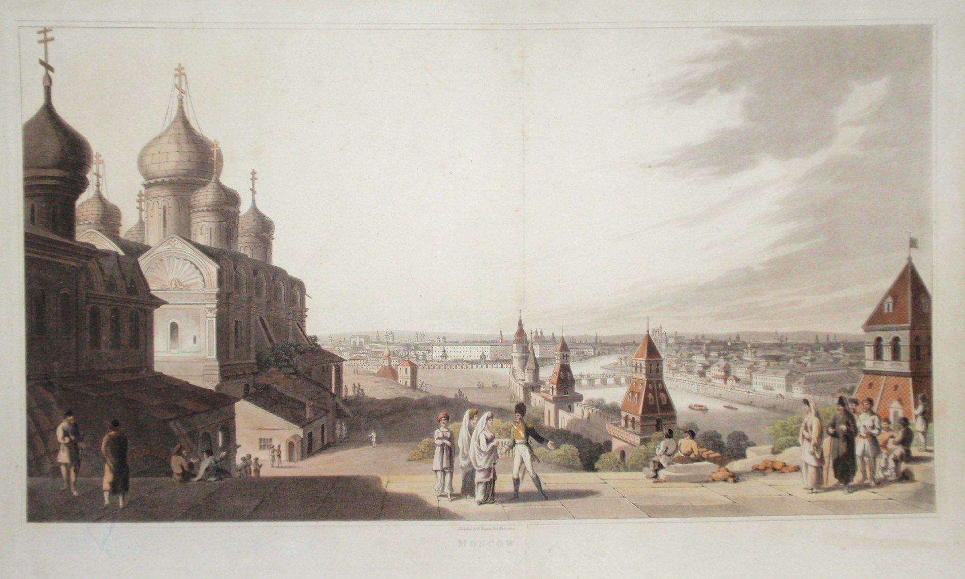 Acquatinta a colori, mm 287x520. Veduta panoramica della capitale russa con il Kremlino in primo piano. Ottimo esemplare.