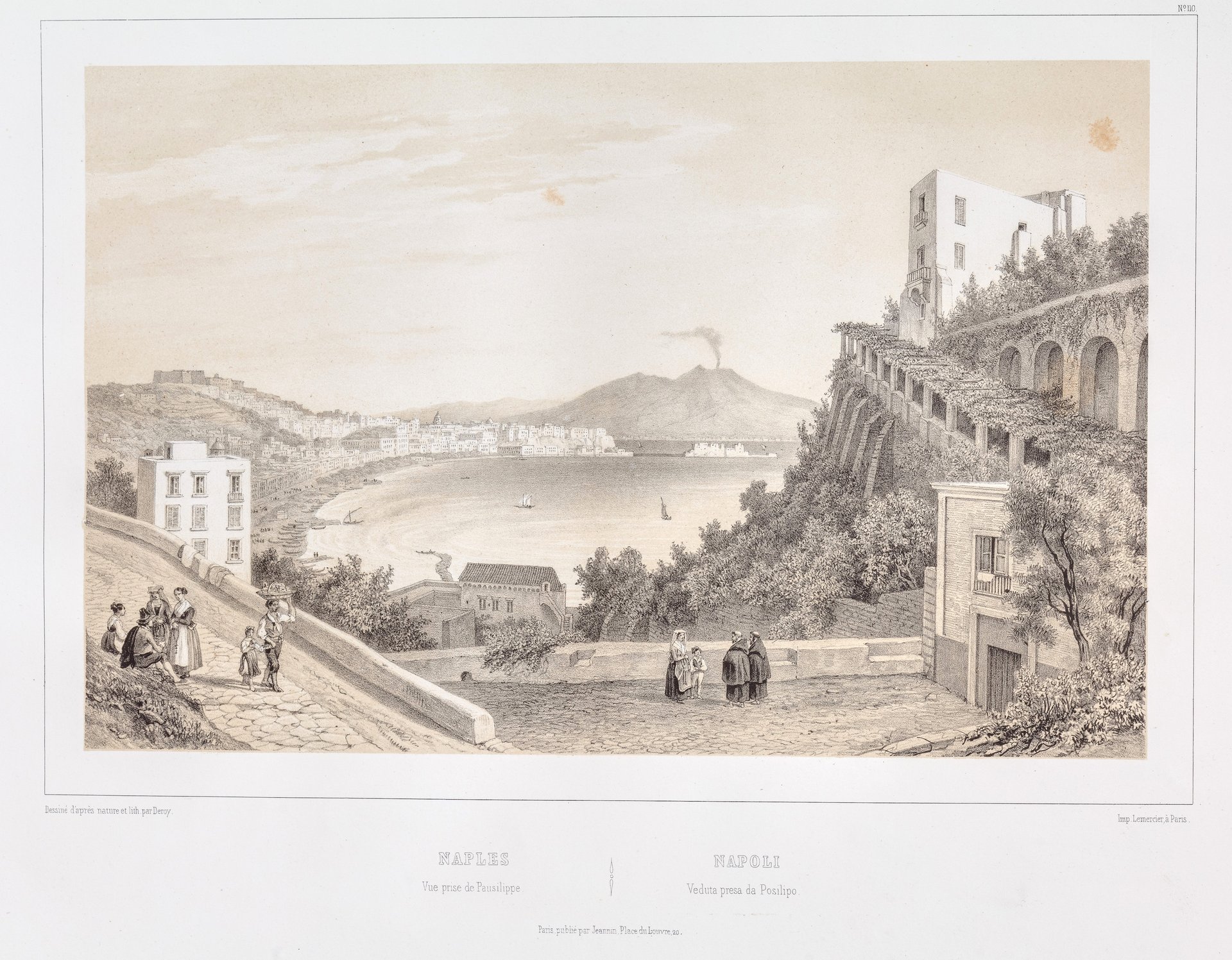 Litografia, mm 178x270 (l'immagine), pubblicata da Lemercier. Tratta da L'Italie. Collection des sites les plus renommes et des monuments les plus remarquables de ce pays. Suggestiva veduta animata da scene popolari. Ottimo esemplare con margini editoriali molto ampi, due fioriture nel cielo.
