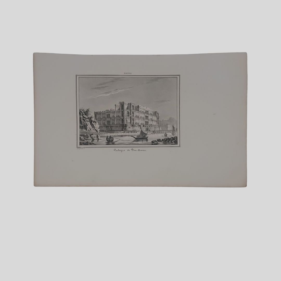 Litografia su disegno di Dolfino, 1852, cm 25,3×15,2 (tavola). In buone condizioni. Tratta da: Cesare Malpica, Panorama dell’universo, Napoli, Stab. dell’Ateneo 1852. Cesare Malpica. Prima avvocato poi insegnante infine giornalista, deve la sua fortuna letteraria – sebbene non univocamente giudicata dalla critica – proprio al reportage. Per lo più concentrate tra gli anni Quaranta e Cinquanta dell’Ottocento, escono le sue impressioni di viaggiatore dedicate a Venti giorni a Roma, Un mese negli Abruzzi: impressioni, ma anche Dal Sebeto al Faro: impressioni di un viaggio nelle Calabrie, e ancora Toscana, Umbria e Magna Grecia per arrivare, nel 1847, a una monografia dedicata alla Basilicata.