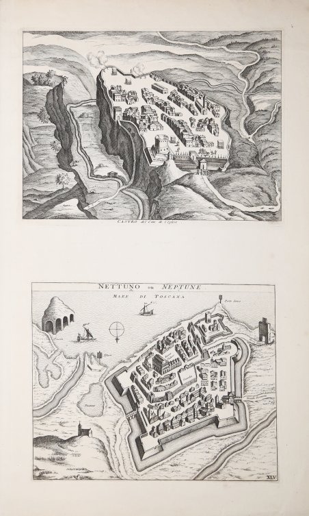 Pianta prospettica di ' Nettuno basata sul modello anonimo stampato da Antonio Salamanca nel 1557. Opera per la prima volta pubblicata nel ' Theatrum Civitatum et admirandorum Italiae, stampato da Johannes Blaeu ad Amsterdam nel 1663. Esemplare tratto dal ' Nouveau Theatre de l'Italie ' pubblicato ad Amsterdam nel 1704/5 da Pierre Mortier e ristampato da R. Alberts nel 1724. Johannes Blaeu, durante la sua lunga attività editoriale pubblica tre volumi sulle città italiane. Nel 1663 i primi tre, suddivisi in Stato della Chiesa, Roma e Regno di Napoli e Sicilia. Alla sua morte i suoi eredi danno alla luce altri due volumi datati 1682 incentrati sulle città del Piemonte e della Savoia, poi ristampati da altri editori nel 1693 e 1697. ' Il francese Pierre Mortier pubblica una ristampa nel 1704/5, intitolata ' Nouveau Theatre de l’Italie. L’opera è in quattro volumi e comprende le lastre del Blaeu, ritoccate e modificate in piccola parte, integrate dall’aggiunta di numerose nuove mappe di proprio disegno, raffiguranti le città della parte settentrionale della penisola, racchiuse nel primo volume dell’opera. L’atlante del Mortier venne pubblicato con testo latino, francese ed olandese. La particolarità che differenzia le due edizioni di Blaeu e Mortier è rappresentata dal fatto che il testo non è al verso della singola mappa (che quindi è bianca nel retro), ma si trova all’inizio di ogni singolo volume. Il grande successo dell’opera diede origine ad un’ulteriore ristampa, praticamente identica, curata da R. Alberts ed edita nel 1724/5. Le opere tratte dalla prima edizione del Blaeu, 1663, sono caratterizzate dalla presenza del testo al verso, qui assente. Incisione in rame, in buono stato di conservazione. Bibliografia Koeman pp. 332/338, Cremonini pp. 83-90. Work first included in ' Theatrum Civitatum et Admirandorum Italiae ad aevi veteris & praesentis temporis faciem expressum à Ioanne Blaeu G. F., ' printed by Johannes Blaeu, Amsterdam, 1663. Example taken from ' Nouveau Theatre de l'Italie ' - Amsterdam nel 1704/5 - by Pierre Mortier or from the da R. Alberts issue (1724). Without descriptive text on the back. The ' Theatrum Civitatum et Admirandorum Italiae ' is the first monumental town book entirely covering Italy, preceded by the "pocket-size" ' Italia Hodierna ' by Jodocus Hondius jr. (1627) and realized in likely competition with Johannes Janssonius who, in 1657, published the ' Theatrum praecipuarum urbium, ' containing a volume dedicated to Italy. Johannes Blaeu, during his long editorial activity published three volumes on Italian cities. In 1663 the first three, divided into the State of the Church, Rome and the Kingdom of Naples and Sicily. At his death his heirs gave birth to two more volumes dated 1682 focused on the cities of Piedmont and Savoy, then reprinted by other publishers in 1693 and 1697. Pierre Mortier publishes a reprint in 1704/5, entitled ' Nouveau Theatre de l'Italie. The work is in four volumes and includes the plates of Blaeu, retouched and modified in small part, supplemented by the addition of several new maps of his own design, depicting the cities of the northern part of the peninsula, enclosed in the first volume of the work. Mortier's atlas was published with Latin, French and Dutch texts. The great success of the work gave rise to a further reprint, virtually identical, edited by R. Alberts and published in 1724/5. Literature Koeman, ' Atlas Neerlandici, pp. 332/338; Cremonini pp. 49-52, 39. Cfr.
