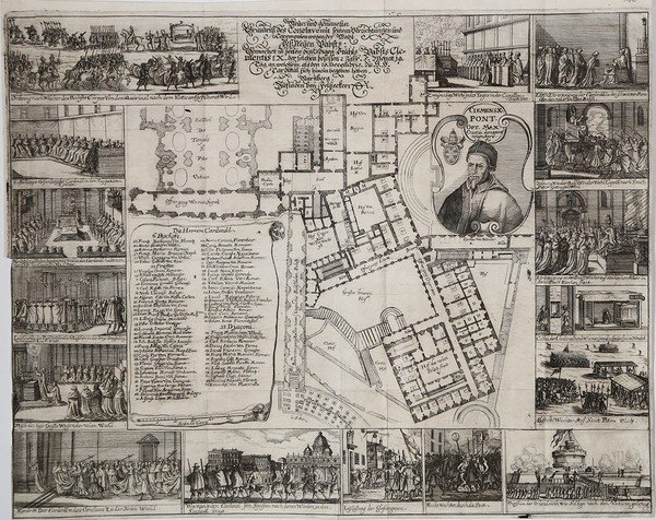Neuer und genauester Gründriss des Conclave mit seinem.L'incisione venne realizzata in occasione del conclave del 1669-1670, convocato a seguito della morte del papa Clemente IX, avvenuta a Roma il 9 dicembre 1669 e si svolse dal 20 dicembre 1669 al 26 aprile 1670, con l'elezione del cardinale Emilio Altieri, con il nome di Clemente X.La cornice è composta da 16 vignette, ciascuna con didascalia, che mostrano diverse cerimonie. Estremamente rara stampa d'occasione pubblicata nella Relationis Historicae Semestralis Continuatio, Jacobi Franci Historische Beschreibung aller Denckwürdigen Geschichten, so sich hin und wider in Europa, Hoch- und Nider Teutschland, auch in Franckreich del 1670. L’opera, meglio conosciuta anche come “Messrelationen”, edita a Francoforte a partire dal 1598, veniva stampata in occasione delle fiere di primavera ed autunno, per fornire notizie sui principali avvenimenti internazionali. Le prime edizioni della raccolta erano firmate a nome di Jacobus Francus, che era lo pseudonimo usato da diversi scrittori, inclusi Conrad Lautenbach e Conrad Memmius. Una Messrelation era una pubblicazione stampata in occasione delle fiere del libro di Francoforte e Lipsia (le più grandi d'Europa all'epoca) che riportava notizie sulle novità politiche e militari dall'ultima fiera. Le Messrelationen sono viste come precursori dei moderni giornali, poiché furono i primi mezzi di informazione stampati ad essere pubblicati periodicamente. Lo studioso austriaco Michael von Aitzing (ca. 1530-1598) è comunemente considerato il loro inventore, avendo pubblicato per la prima volta una Relatio Historica (stampata a Colonia) alla fiera del libro dell'autunno 1583 a Francoforte, in cui raccontava gli eventi nei Paesi Bassi dal febbraio 1580. Questo fu un enorme successo e dal 1588 Aitzing pubblicò le sue "relazioni" due volte all'anno, per la fiera del libro di Pasqua a Lipsia e per la fiera del libro d'autunno a Francoforte. Dal 1590, i concorrenti pubblicarono le loro Messrelationen; la prima di Francoforte fu pubblicata nel 1591 (fino al 1806), la prima di Lipsia nel 1605 (fino al 1730). Acquaforte, tracce delle pieghe editoriali del foglio - più volte ripiegato per essere inserito nel volume, rifilata ai margini, in generale in ottimo stato di conservazione. Bibliografia Rosseaux, Ulrich (2004), Die Entstehung der Meßrelationen. Zur Entwicklung eines frühneuzeitlichen Nachrichtenmediums aus der Zeitgeschichtsschreibung des 16. Jahrhunderts, Historisches Jahrbuch, 124; Stöber, Rudolf (2000). Deutsche Pressegeschichte. Einführung, Systematik, Glossar. Constance. p. 51. Rare plate realized on the occasion of the1669-1670 conclave. Shows a portion of the floor plan of the Vatican Palace where the conclave was held, names of the attending cardinals, and around 16 scenes of the death of the old pope and the elections of the new one.The Conclave of 1669-1670 lasted four months and ten days. It began on December 20, 1669. On the twenty-ninth of April, 1670 Emilio Cardinal Altieri, Cardinal Priest without red hat and without titular church, Bishop of Camerino, aged seventy-nine, was elected, The sheet is published in the Relationis Historicae Semestralis Continuatio, Jacobi Franci Historische Beschreibung aller Denckwürdigen Geschichten, so sich hin und wider in Europa, Hoch- und Nider Teutschland, auch in Franckreich of 1670. The work, also known as "Messerelationen", published in Frankfurt since 1598, was printed on the occasion of spring and autumn fairs, to provide news about major international events. Early editions of the collection were signed in the name of Jacobus Francus, which was the pseudonym used by several writers, including Conrad Lautenbach and Conrad Memmius. A Messrelation was a print published in the 16th to 18th century for the book fairs in Frankfurt and Leipzig (the largest in Europe at their time) which reported news about political and military news since the last fair. Messrelationen are seen as precursors to modern newspapers as they were the first printed news media to be published periodically. The Austrian scholar Michael von Aitzing (ca. 1530–1598) is commonly seen as their inventor, having published for the first time a Relatio Historica (printed in Cologne) at the autumn 1583 book fair in Frankfurt, in which he related the events in the Low Countries since February 1580. This was a huge success and from 1588 Aitzing published his "relations" twice a year, for the Easter book fair at Leipzig and for the autumn book fair at Frankfurt. Since 1590, competitors published their own Messrelationen. The first one from Frankfurt was published in 1591 (running until 1806), the first one from Leipzig in 1605 (running until 1730). Etching, traces of the editorial folds of the folio - folded several times to fit into the volume, trimmed at the margins, generally in very good condition. Bibliografia Rosseaux, Ulrich (2004), Die Entstehung der Meßrelationen. Zur Entwicklung eines frühneuzeitlichen Nachrichtenmediums aus der Zeitgeschichtsschreibung des 16. Jahrhunderts, Historisches Jahrbuch, 124; Stöber, Rudolf (2000). Deutsche Pressegeschichte. Einführung, Systematik, Glossar. Constance. p. 51. Cfr.