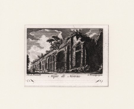 Veduta tratta dalla celebre Raccolta di num. 320 Vedute sì antiche, che moderne della città di Roma. …Incise a bulino in N. 80 rami, In Roma Nella Calcografia di Agapito Franzetti a Torsanguigna Col Permesso. ' L’opera si compone di un frontespizio calcografico e di 80 tavole numerate, ognuna composta da quattro vedute. Viene stampata senza data; molti repertori la datano intorno al 1790 circa, forse perché stampata su carta vergata. Una datazione intorno al 1800 ci sembra tuttavia più plausibile. ' Agapito Franzetti, calcografo attivo a Roma con bottega tra via del Corso e Torsanguigna, è noto per le sue piccole incisioni di veduta che servivano spesso come biglietti da visita. Tutte contengono, infatti, una linea in basso, dove si poteva apporre il proprio nome ad inchiostro. Come indicato nel titolo, le vedute raffigurano sia monumenti e antiche rovine che vedute “moderne”, con piazze, chiese e ville. Ciascuna tavola reca, in basso al centro, il nome dell’incisore. Gli artisti coinvolti sono sei: Jean-Jerome Baugean; Antonio Giuseppe Barbazza; Giovanni Battista Cipriani; Francesco Morelli; Antonio Poretta e Domenico Pronti. Molte delle vedute derivano dalla celebre opera di Giuseppe Vasi, Delle magnificenze di Roma antica e moderna. Pubblicata in 10 volumi dal 1747 al 1761, l’opera presenta 238 incisioni in rame, ciascuna incisione con testo narrativo che fornisce informazioni storiche e documentarie. ' Acquaforte, in buono stato di conservazione. ' Bibliografia: A. Bertarelli, H. Prior, Il biglietto da visita italiano. Contributo alla storia del costume e dell'incisione nel secolo XVII, Bergamo 1911, p. 162. View of the city printed in Rome by the publisher Agapito Franzetti. Taken from Raccolta di num. 320 Vedute sì antiche, che moderne della città di Roma. …Incise a bulino in N. 80 rami, In Roma Nella Calcografia di Agapito Franzetti a Torsanguigna Col Permesso. ' The work consists of an intaglio frontispiece and 80 numbered plates, each consisting of four views. It is printed without date; many repertories date it around 1790, perhaps because it was printed on laid paper. A date around 1800 seems more plausible. Franzetti, a chalcographer working in Rome with a workshop between Via del Corso and Torsanguigna, is known for his small engravings of views that were often used as business cards. They all contain a line at the bottom where one's name could be written in ink. The small views were often printed four to a sheet. As indicated in the title, the views depict both monuments and ancient ruins and "modern" views, with squares, churches and villas. Each table bears, at the bottom center, the name of the engraver. There are six artists involved: Jean-Jerome Baugean; Antonio Giuseppe Barbazza; Giovanni Battista Cipriani; Francesco Morelli; Antonio Poretta and Domenico Pronti. ' The views are made after Giuseppe Vasi’s monumental work Delle magnificenze di Roma antica e moderna. Published in 10 volumes from 1747 to 1761, the work features 238 copper engravings, each engraving with a narrative text that provides historical and documentary information. ' Bibliografia: A. Bertarelli, H. Prior, Il biglietto da visita italiano. Contributo alla storia del costume e dell'incisione nel secolo XVII, Bergamo 1911, p. 162. Cfr.