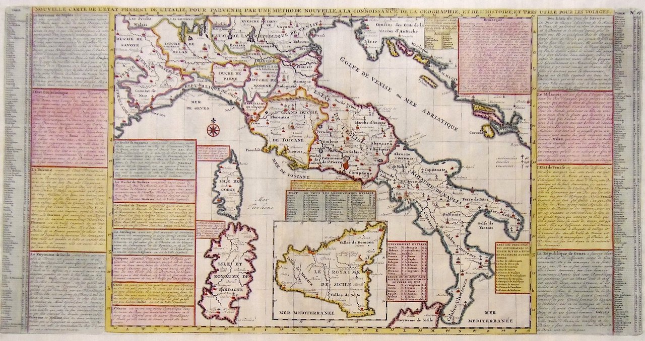 Incisione in rame, mm 335x650, colorata a mano, raffigurante l'Italia intera al centro, circondata da numerosi riquadri con testo storico esplicativo delle varie regioni; tratta da "Atlas Historique".<BR>Esemplare in ottimo stato di conservazione.