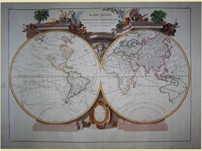 Incisione in rame, colore d'epoca, 385x650 (la sola parte incisa). Interessante e decorativo mappamondo diviso in due emisferi, terrestre e marittimo, quest'ultimo incentrato sulla zona delle recenti scoperte nel Pacifico meridionale. Tratta da "Atlas Universel" stampato a Venezia fra il 1776 ed il 1784. Ottimo esemplare. € 1.900. Venezia, 1780 ca. Nouvelle Mappe Monde dedièe au progrès de nos connoissances. Incisione in rame, colore d'epoca, 385x650 (la sola parte incisa). Interessante e decorativo mappamondo diviso in due emisferi, terrestre e marittimo, quest'ultimo incentrato sulla zona delle recenti scoperte nel Pacifico meridionale. Tratta da "Atlas Universel" stampato a Venezia fra il 1776 ed il 1784. Ottimo esemplare.