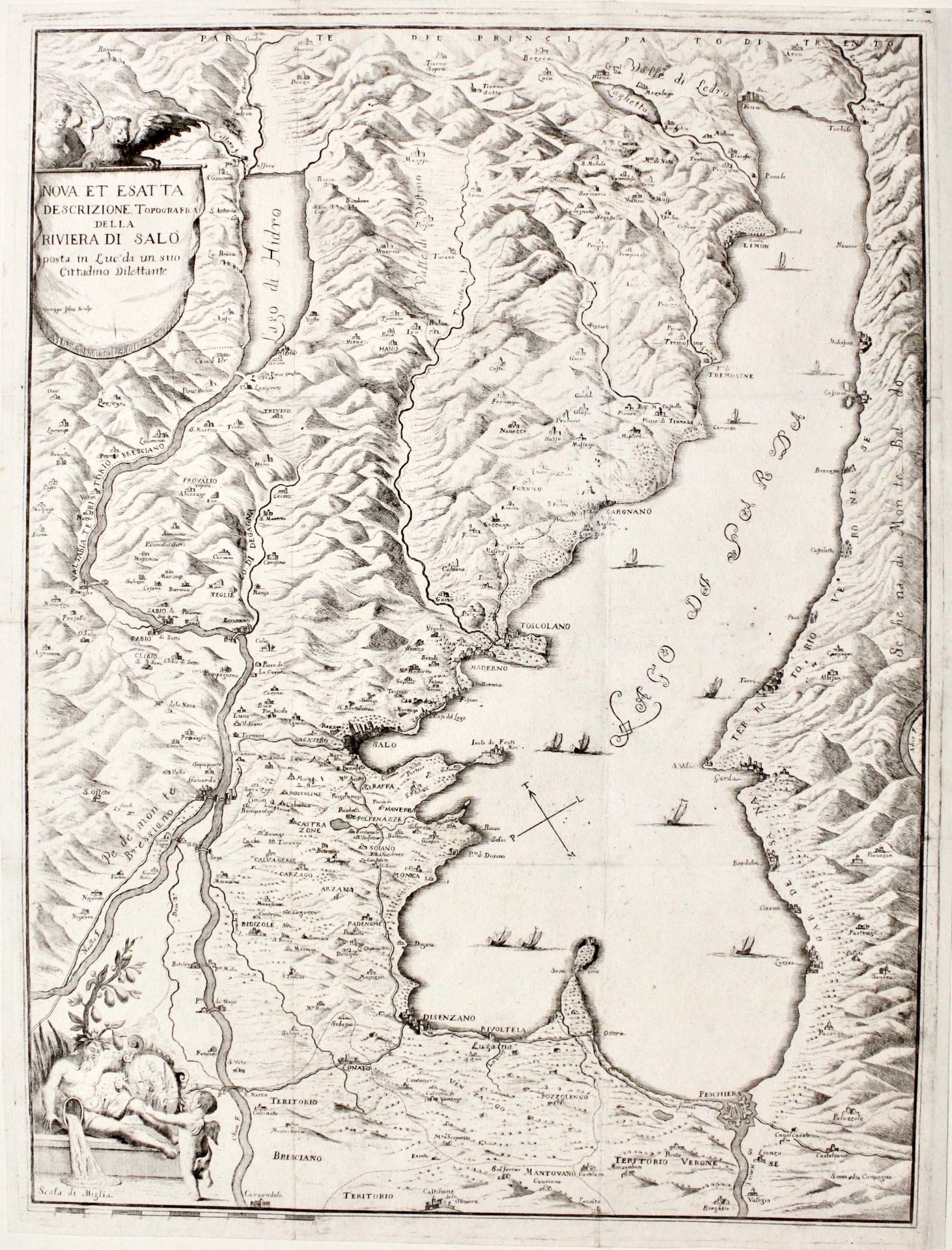 Incisione in rame, mm 560x420, traccia di pieghe editoriali, un minimo restauro al margine destro. Rara carta geografica del lago di Garda incisa dal veronese Filosi; in alto a sinistra campeggia il leone marciano ad ali spiegate che insieme ad un punto sorregge il drappo col titolo; in basso una allegoria di Benaco. La carta è inserita in “Salò e sua Riviera descritta…” di Silvan Cattaneo e Bongianni Grattarolo. SPINI-SINISTRI, Il Garda nelle stampe n. 6 pag. 16.