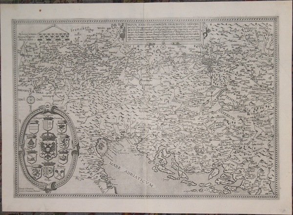 Nova exactissimaque descriptio Danubii (qui alias Ister cognominatur) fluminis permagni totoque terrarum orbe celebratissimi. per Christianum Sgrothonuma.tl Geogrph. Rara carta geografica del corso del Danubio di Gerard de Jode, stampata ad Anversa intorno al 1570 circa. Esemplare tratto dalla seconda edizione dell'atlante del De Jode, curata dal figlio Cornelis e denominata Speculum Orbis Terrae, 1593, con il testo latino al verso e il numero di pagina 27. Il foglio raffigura solo la parte occidentale del corso del Danubio. La carta venne disegnata da Christian Sgrooten ed è incisa dai fratelli Doetecum, la cui firma appare in lastra in basso a sinistra Ioannes a Deutecu, Lucas a Deutecum fecerunt. Il territorio raffigurato è compreso tra le sorgenti del Danubio e la confluenza della Drava nello stesso; include il Friuli, la Slovenia, l’Austria, la Croazia, la Serbia e la Bosnia. Gerard de Jode fu un celebre incisore e stampatore, nativo di Nimega nel 1509. Dopo aver compiuto studî di matematica e di cosmografia, apprese l'arte dell'incisione, fu per qualche tempo alla corte di Carlo V a Bruxelles, poi si trasferì ad Anversa, dove già a partire dal 1551 cominciò a stampare incisioni artistiche di Franz Huys, Martin de Vos, Corneille de Cort, ecc.; ma presto si specializzò nell'incisione di carte geografiche e stampò ad Anversa il celebre mappamondo di Giacomo Gastaldi, nel 1568 l'Italia dello stesso, poi altre carte di molti autori, anche italiani, nel 1564 un grande mappamondo di Abraham Ortelius (Nova totius Terrarum Orbis iuxta neotericorum traditionem descriptio) e infine nel 1578 un vero e proprio atlante con il titolo di ' Speculum Orbis Terrarum, in 65 tavole, di autori diversi, già in parte pubblicate isolatamente. È uno dei primi atlanti moderni (preceduto soltanto dal ' Theatrum ' dell'Ortelius), oggi estremamente raro. Negli ultimi anni della sua vita attendeva a preparare carte dei singoli continenti, di grandi dimensioni, che forse furono poi pubblicate, al pari di un gran mappamondo, dal figlio Cornelio. Questi, nato ad Anversa nel 1568, continuò con molta sagacia l'opera del padre; nel 1589 pubblicò un mappamondo, nel 1593 una nuova edizione dello Speculum, accresciuta, in 109 carte, e nel 1596 una ' Introductio geographica in tabulas Europae, Asiae, Africae et Americae; ' le tavole, cui qui si allude, sono probabilmente quelle preparate dal padre e delle quali il figlio curò la stampa; esse non sono peraltro giunte fino a noi. Cornelio viaggiò poi a lungo nei paesi nordici e anche in Spagna. Ritornando in patria, morì a Mons il 17 ottobre 1600. Acquaforte, finemente colorata a mano, in perfetto stato di conservazione. Bibliografia New Hollstein, Doetecum III, no. 586; Koeman III, 1110; Ortroy S. 126, no. 98: Karrow 70/17, Szathmáry 84/B. ' Nova exactissimaque descriptio Danubii (qui alias Ister cognominatur) fluminis permagni totoque terrarum orbe celebratissimi. per Christianum Sgrothonuma.tl Geogrph. Rare map of the course of the Danube by Gerard de Jode, printed in Antwerp about 1570. Example from the second edition of De Jode's atlas, edited by his son Cornelis and called Speculum Orbis Terrae, 1593. Latin text on verso and page number 27. The sheet depicts only the western part of the Danube's course. The map was drawn by Christian Sgrooten and is engraved by the Doetecum brothers, whose signature appears on the plate at lower left Ioannes a Deutecu, Lucas a Deutecum fecerunt. The territory depicted is between the sources of the Danube and the confluence of the Drava into it; it includes Friuli, Slovenia, Austria, Croatia, Serbia and Bosnia. Gerard de Jode was a celebrated engraver and printer, a native of Nijmegen in 1509. After studying mathematics and cosmography, he learned the art of engraving, was for some time at the court of Charles V in Brussels, then moved to Antwerp, where as early as 1551 he began to print artistic engravings by Franz Huys, Martin de Vos, Corneille de Cort, etc. ; but soon specialized in map engraving and printed in Antwerp the famous world map of Giacomo Gastaldi, in 1568 Italy by the same, then other maps by many authors, including Italians, in 1564 a large world map by Abraham Ortelius (Nova totius Terrarum Orbis iuxta neotericorum traditionem descriptio) and finally in 1578 a full-fledged atlas with the title Speculum Orbis Terrarum, in 65 plates, by different authors, already partly published in isolation. It is one of the earliest modern atlases (preceded only by Ortelius' Theatrum), which is extremely rare today. In the last years of his life he waited to prepare maps of the individual continents, large in size, which were perhaps later published, like a great world map, by his son Cornelius. The latter, born in Antwerp in 1568, continued his father's work with much sagacity; in 1589 he published a world map, in 1593 a new edition of the Speculum, enlarged, in 109 maps, and in 1596 an Introductio geographica in tabulas Europae, Asiae, Africae et Americae; the plates, alluded to here, are probably those prepared by his father and of which his son took care of the printing; they have not, however, come down to us. Cornelius then traveled extensively in the Nordic countries and also in Spain. Returning to his homeland, he died in Mons on October 17, 1600. Etching, finely hand-colored, in perfect condition. Bibliografia New Hollstein, Doetecum III, no. 586; Koeman III, 1110; Ortroy S. 126, no. 98: Karrow 70/17, Szathmáry 84/B. Cfr.