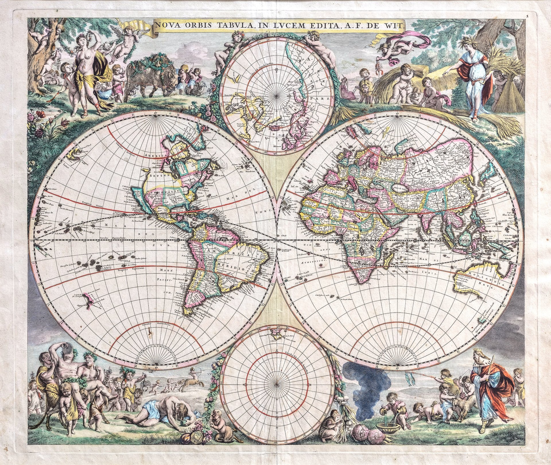 Incisione in rame, mm 464 x 546, dipinta a mano d’epoca. Primo stato su due, senza cherubini nelle cuspidi, a cui seguirà nel 1680 una nuova lastra con cornice e con numerosi aggiornamenti geografici delle nuove scoperte nel Pacifico e dell’interno del continente americano. In questo primo stato compaiono la California come isola secondo il prototipo di Briggs (che sarà poi sostituita dal modello sansoniano) e Anian con lo stretto nella costa nord-ovest del continente americano. Nel Pacifico non compare ancora la Nova Guinea nell’emisfero occidentale. Bellissimo esemplare con minimi restauri alla piegatura centrale in basso.<BR>Uno fra i più decorativi mappamondi olandesi seicenteschi. Shirley, R.W. The Mapping of the World pag. 468: “Il mappamondo di De Wit è uno dei più attraenti dell’epoca. Le brillanti scene agli angoli combinano le immagini delle quattro stagioni, degli elementi e dei segni zodiacali in modo equilibrato e naturalistico”.<BR>De Wit (1629 c. -1706) fu un cartografo e commerciante di mappe nato a Gouda, che lavorò e morì ad Amsterdam. Si trasferì in città nel 1648, dove aprì un’attività di stampa. A partire dagli anni ’60 è noto soprattutto per atlanti e piante di città olandesi. Dopo la morte di Frederic nel 1706, la moglie Maria gestì il negozio per quattro anni prima di venderlo poiché il figlio Franciscus non aveva alcun interesse per il negozio di mappe. La maggior parte delle tavole andò a Pieter Mortier, la cui ditta divenne Covens & Mortier, una delle più grandi case cartografiche del XVIII secolo.<BR>Bibliografia: Shirley 451<BR>Copper engraving, 464 x 546 mm, original colour. First state of two, without cherubs in the cusps, to be followed in 1680 by a new plate with frame and with numerous geographical updates of the new discoveries in the Pacific and the interior of the American continent. In this first state appear California as an island according to Briggs’ prototype (later to be replaced by the Sansonian model) and Anian with the strait on the northwest coast of the American continent. Nova Guinea does not yet appear in the Pacific in the western hemisphere. Beautiful example with minimal restorations to the central fold at the bottom.One of the most decorative 17th century Dutch globes. Shirley, R.W. The Mapping of the World p. 468: ‘De Wit’s globe is one of the most attractive of the period. The brilliant scenes in the corners combine the images of the four seasons, the elements and the signs of the zodiac in a balanced and naturalistic manner’. De Wit (c. 1629 -1706) was a cartographer and map dealer born in Gouda, who worked and died in Amsterdam. From the 1660s onwards, he is best known for atlases and plans of Dutch cities. After his death, most of the plates went to Pieter Mortier, whose firm became Covens & Mortier, one of the largest map houses of the 18th century. Bibliography: Shirley 451