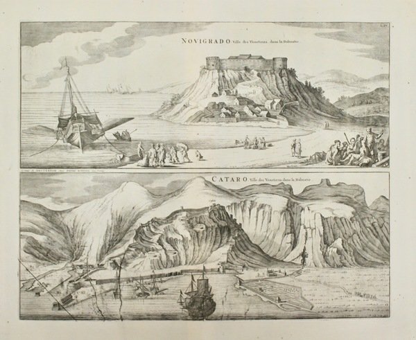 Incisione in rame, mm 420x520. Due belle vedute prospettiche delle cittadine Dalmate. Mortier, editore attivo ad Amsterdam ad inizio '700, ristampò il "Theatrum Civitatum…Italiae" di Blaeu del 1663 aggiungendovi un quarto volume, relativo a nord Italia, Dalmazia, Grecia e Toscana. Bell'esemplare con ampi margini. La veduta di cattaro con le consuete crepe editoriali nella lastra.