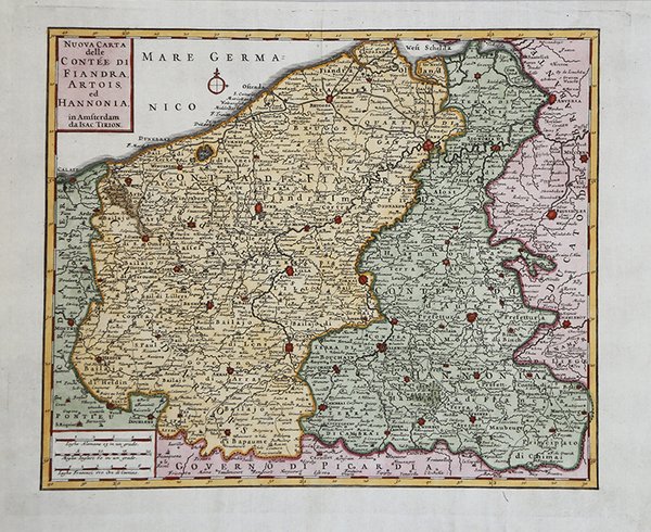 Carta geografica pubblicata a Venezia da Giambattista Albrizzi. Le carte di Albrizzi, derivanti dalle opere di Guillaulme de L’Isle, Iasaak Tirion, furono preparate per il suo Atlante Novissimo, che contiene tutte le parti del mondo del 1740 (volume 1) - 1750 (volume 2). Per le carte italiane l’Albrizzi utilizzò invece fonti diverse. Allo stesso tempo, furono utilizzate anche per illustrare Lo stato presente di tutti i paesi e popoli del mondo naturale, politico e morale con nuove osservazioni degli antichi e moderni viaggiatori. Scritto in inglese dal signor Salmon. Tradotto in Ollandese, e Francese, Tedescho ed ora in Italiano. In Venezia, Presso Giambattista Albrizzi MDCCXXXVII-MDCCLVI (1737-66), opera - in ventisette volumi – traduzione italiana dell’opera di Thomas Salmon ' Modern history, or the present state of all nations, che apparve tra il 1725 e il 1739 a Londra in 32 volumi. Giambattista Albrizzi fa parte di una famiglia di tipografi ed editori veneziani di origine bergamasca. Iniziatore dell'attività tipografica fu, negli ultimi decenni del XVII secolo, Girolamo Albrizzi a cui successe il figlio Giambattista, attivo particolarmente nel ventennio 1730-50. Diede grande impulso all'arte tipografica veneziana, legando il proprio nome a una serie di splendide edizioni, per cui si valse della collaborazione dei migliori disegnatori e incisori del tempo: Piazzetta, Zanetti, Pitteri e Bartolozzi. Incisione in rame, finemente colorata a mano, in ottimo stato di conservazione. Bibliografia V. Valerio, Cartografi Veneti, p. 139. Map published in Venice by Giambattista Albrizzi. Albrizzi's maps, derived from the works of Guillaulme de L'Isle and Iasaak Tirion, were prepared for his ' Atlante Novissimo, che contiene tutte le parti del mondo ' from 1740 (volume 1) - 1750 (volume 2). At the same time, they were also used to illustrate ' Lo stato presente di tutti i paesi e popoli del mondo naturale, politico e morale con nuove osservazioni degli antichi e moderni viaggiatori. Scritto in inglese dal signor Salmon. Tradotto in Ollandese, e Francese, Tedescho ed ora in Italiano. In Venezia, Presso Giambattista Albrizzi MDCCXXXVII-MDCCLVI ' (1737-66), work - in twenty-seven volumes - Italian translation of the books by Thomas Salmon ' Modern history, or the present state of all nations, which appeared between 1725 and 1739 in London in 32 volumes. Giambattista Albrizzi is part of a family of printers and publishers of Venice from Bergamo. Start of printing was in the last decades of the seventeenth century, Girolamo Albrizzi was succeeded by his son Giambattista, particularly active in the twenty years 1730-50. He gave great impetus to the art printing Venetian, linking its name to a series of magnificent editions, which earned him the collaboration of the best designers and engravers of the time: Piazzetta, Zanetti, Pitteri and Bartolozzi. Copperplate, with fine later hand colour, in good condition. Bibliografia V. Valerio, ' Cartografi Veneti, p. 139. Cfr.