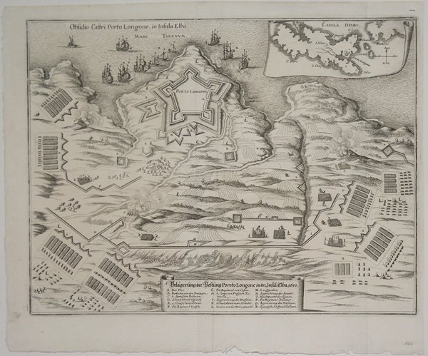 Veduta a volo d'uccello, con i vari schieramenti, dell'assedio spagnolo alla città. In alto a destra, entro stendardo, piccola carta geografica dell'isola. Tavola tratta dal celebre “Theatrum Europaeum” una sorta di giornale sulla storia delle terra, in lingua tedesca, iniziato da Matthäus Merian e proseguito poi da altre editori, che venne pubblicato tra il 1633 e il 1738 [in 21 volumi in quarto]. Matthäus Merian il vecchio (1593-1650) incisore svizzero nativo di Basilea, lavorò a Francoforte dove ebbe modo di lavorare nella bottega fondata da Theodor de Bry. Merian si segnalò, tanto da sposare Maria Magdalena de Bry, figlia di Johann Theodore de Bry, e dal 1625 circa da prendere in mano l'azienda, dandole un notevole incremento ed occupandosi in particolare dello sviluppo dei libri di topografia e di viaggi. Nella tipografia Merian lavorarono anche i figli Kaspar e soprattutto il quotato Matthaeus il giovane, i quali dopo la morte del padre proseguirono con immutato successo la gestione dell'attività che continuò fino al 1727. Nel 1638 Merian stampò la Neuwe Archontologia cosmica, das ist, Beschreibung aller Kaÿserthumben, Königreichen und Republicken der gantzen Welt opera sulla descrizione del Mondo già uscita dieci anni prima con una veste modesta che Merian rivoluzionò arricchendola con 98 tavole alcune delle quali a doppio foglio. L'Archontologia conobbe altre quattro edizioni fino al 1695 con testo o in latino o in tedesco, non omogenee per numero e tipologia di incisioni inserite. Nel 1640 venne pubblicato Itinerarium Italiæ Nov-antiquæ scritto da Martin Zeiller, ristampato nel 1688 col titolo Topographiæ Italiæ. Incisione in rame, in buono stato di conservazione. Plate included in the “Theatrum Europaeum”; was a journal on the history of the German-speaking lands by Matthäus Merian, published between 1633 and 1738 in 21 quarto volumes. Matthäus Merian the Elder (1593-1650) Swiss engraver native of Basel, worked in Frankfurt where he was able to work in the workshop founded by Theodor de Bry. Merian distinguished himself, so much so that he married Maria Magdalena de Bry, daughter of Johann Theodore de Bry, and from about 1625 he took over the company, giving it a considerable increase and dealing in particular with the development of topography and travel books. The Kaspar sons and above all the renowned Matthaeus the younger also worked in the Merian typography, who after the death of their father continued with unchanged success the management of the business which continued until 1727. In 1638 Merian printed the Neuwe Archontologia cosmica, das ist, Beschreibung aller Kaÿserthumben, Königreichen und Republicken der gantzen Welt works on the description of the World already published ten years earlier with a modest look that Merian revolutionized by enriching it with 98 tables, some of which are double sheets. The Archontologia went through four other editions up to 1695 with text either in Latin or in German, not homogeneous in terms of the number and type of engravings inserted. In 1640 Itinerarium Italiæ Nov-antiquæ written by Martin Zeiller was published, reprinted in 1688 with the title Topographiæ Italiæ. Etching, very good condition. Cfr.