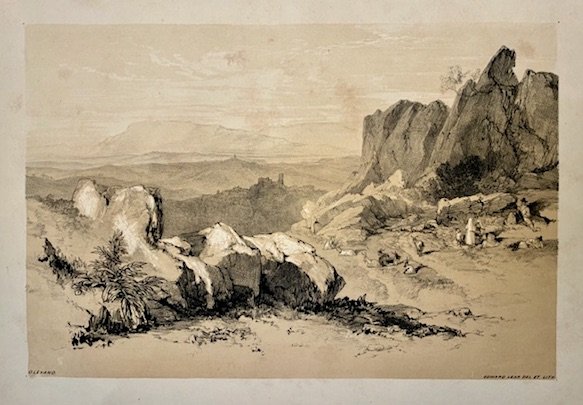 Litografia originale in tonalità seppia (cm. 36,2x24,3 più ampi margini bianchi) tratta dall’opera ‘Views of Rome and its Environs’. Esemplare in ottimo stato di conservazione. Non comune.‘Views of Rome and its Environs’ è sicuramente l’opera di viaggio più importante realizzata dallo scrittore e artista inglese Edward Lear assieme alle ‘Illustrated excursions in Italy’ del 1846 ed ai ‘Journals of a Landscape Painter in Southern Calabria and the Kingdom of Naples’ (1852). Le belle tavole, di gusto romantico, raffigurano scorci inconsueti della città di Roma e piccoli borghi e paesi dei suoi dintorni. La Regina Vittoria, impressionata dalla bellezza delle litografie, chiese all’autore di farle da insegnante di disegno per un paio di mesi presso la residenza di Osborne House.
