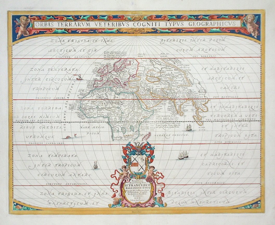 Incisione in rame, di mm 400x510, colorata a mano, tratta dal grande atlante di Jansson. Jansson, in collaborazione con il cognato Henricus Hondius, e successivamente dal 1638 da solo, fu il più importante concorrente di Blaeu a cui ispirò ed uniformò la produzione, tanto da costringere quest'ultimo, anch'egli Jansson di cognome, a scegliere uno pseudonimo per differenziare la propria produzione. Buon esemplare, con bel cartiglio figurato e titolo entro festone, rappresenta il mondo conosciuto dagli antichi.
