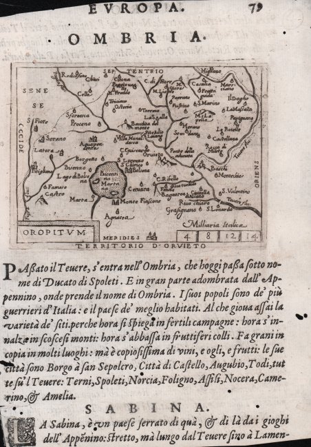 Carta in miniatura preparata per l’edizione italiana dell’Epitome theatri Orteliani, una riduzione delle carte del ' Theatrum Orbis Terrarum ' di Abraham Ortelius, pubblicata per la prima volta ad Anversa da Philip Galle nel 1577 con il titolo di ' Spieghel der werelt ' (Specchio del mondo). Nel 1593, sempre ad Anversa, viene alla luce il ' Theatro del mondo, l’edizione italiana dell’opera curata dal Galle. Nel 1598, Pietro Maria Marchetti, stampa a Brescia il ' Theatro del mondo, edizione “pirata” dell’opera originale del Galle, corredata da 109 mappe fatte incidere copiando le originali. Le carte vengo incise da un anonimo artista e inserite in una pagina di testo in italiano e furono usate anche per illustrare le "Relationi universali di Giovanni Botero", pubblicato sempre in Brescia nel 1599. È nota anche una ristampa delle stesse ' Relationi, pubblicata da Alessandro Vecchi a Venezia nel 1618 e ancora nel "Theatro del mondo" di Giovanni M. Turrini, (1655), e Scipione Banca (1657); queste due ultime edizioni recano il testo descrittivo al verso della carta. Incisione in rame, in ottimo stato di conservazione. Rara. Bibliografia G. King, ' Miniature Antique Maps, ' pp. 78-79; ' Alberto Satolli, Imago VV, Le rappresentazioni della città di Orvieto dalle origini ad oggi, p. 104, tav. XXXIII. Miniature map prepared for the Italian edition of the ' Epitome theatri Orteliani, ' a reduction of the maps of Abraham Ortelius' ' Theatrum Orbis Terrarum, first published in Antwerp by Philip Galle in 1577 under the title ' Spieghel der werelt (Mirror of the World). In 1593, also in Antwerp, the ' Theatro del mondo, ' the Italian edition of the work edited by Galle, came to light. In 1598, Pietro Maria Marchetti, printed in Brescia his ' Theatro del mondo, a "pirate" edition of Galle's original work, accompanied by 109 maps made by copying the originals. The maps were engraved by an anonymous artist and inserted into a page of Italian text and were also used to illustrate Giovanni Botero's "Relationi universali" also published in Brescia in 1599. A reprint of the same ' Relationi ' is also known, published by Alessandro Vecchi in Venice in 1618 and again in Giovanni M. Turrini's "Theatro del mondo" (1655), and Scipione Banca (1657); the latter two editions bear the descriptive text on the verso of the map. Copperplate engraving, in very good condition. Rare. Bibliografia G. King, ' Miniature Antique Maps, ' pp. 78-79; ' Alberto Satolli, Imago VV, Le rappresentazioni della città di Orvieto dalle origini ad oggi, p. 104, tav. XXXIII. Cfr.