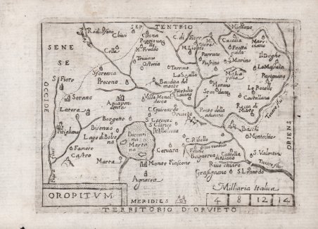 Carta in miniatura preparata per l’edizione italiana dell’Epitome theatri Orteliani, una riduzione delle carte del ' Theatrum Orbis Terrarum ' di Abraham Ortelius, pubblicata per la prima volta ad Anversa da Philip Galle nel 1577 con il titolo di ' Spieghel der werelt ' (Specchio del mondo). Nel 1593, sempre ad Anversa, viene alla luce il ' Theatro del mondo, l’edizione italiana dell’opera curata dal Galle. Nel 1598, Pietro Maria Marchetti, stampa a Brescia il ' Theatro del mondo, edizione “pirata” dell’opera originale del Galle, corredata da 109 mappe fatte incidere copiando le originali. Le carte vengo incise da un anonimo artista e inserite in una pagina di testo in italiano e furono usate anche per illustrare le "Relationi universali di Giovanni Botero", pubblicato sempre in Brescia nel 1599. È nota anche una ristampa delle stesse ' Relationi, pubblicata da Alessandro Vecchi a Venezia nel 1618 e ancora nel "Theatro del mondo" di Giovanni M. Turrini, (1655), e Scipione Banca (1657); queste due ultime edizioni recano il testo descrittivo al verso della carta. Esemplare dall'edizione del 1657 curata da Scipione Banca. Incisione in rame, ' in ottimo stato di conservazione. Rara. Bibliografia G. King, ' Miniature Antique Maps, ' pp. 78-79; ' Alberto Satolli, Imago VV, Le rappresentazioni della città di Orvieto dalle origini ad oggi, p. 126, tav. XXXVIII. Miniature map prepared for the Italian edition of the ' Epitome theatri Orteliani, ' a reduction of the maps of Abraham Ortelius' ' Theatrum Orbis Terrarum, first published in Antwerp by Philip Galle in 1577 under the title ' Spieghel der werelt (Mirror of the World). In 1593, also in Antwerp, the ' Theatro del mondo, ' the Italian edition of the work edited by Galle, came to light. In 1598, Pietro Maria Marchetti, printed in Brescia his ' Theatro del mondo, a "pirate" edition of Galle's original work, accompanied by 109 maps made by copying the originals. The maps were engraved by an anonymous artist and inserted into a page of Italian text and were also used to illustrate Giovanni Botero's "Relationi universali" also published in Brescia in 1599. A reprint of the same ' Relationi ' is also known, published by Alessandro Vecchi in Venice in 1618 and again in Giovanni M. Turrini's "Theatro del mondo" (1655), and Scipione Banca (1657); the latter two editions bear the descriptive text on the verso of the map. Map taken from Scipione Banca's "Theatro del mondo" (1657). Copperplate engraving, in very good condition. Rare. Bibliografia G. King, ' Miniature Antique Maps, ' pp. 78-79; ' Alberto Satolli, Imago VV, Le rappresentazioni della città di Orvieto dalle origini ad oggi, p. 126, tav. XXXVIII. Cfr.