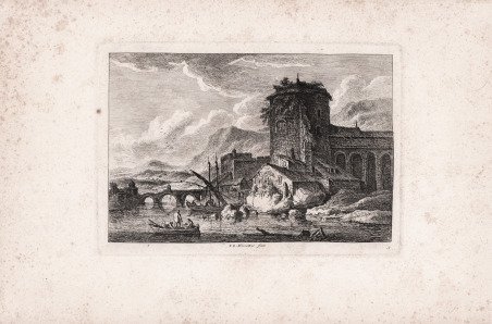 Tre pescatori su barca a remi in primo piano; veduta di una città, un mulino a vento e un ponte in lontananza. Acquaforte, 1759-63 circa, firmata in basso. Bella impressione, stampata su carta vergata, con margini, ottimo stato di conservazione. Pittore, disegnatore e acquafortista austriaco. Dipinse dapprima paesaggi, alla maniera degli Olandesi italianizzanti, poi dopo un soggiorno a Parigi (1759-63) e a Roma (1763-64), trasferì le sue ambizioni al disegno e alla stampa grafica, che praticò copiando opera di olandesi e fiamminghi, e sviluppò una pregevole tecnica per le acqueforti, che applicò ai suoi stessi disegni. Le serie di paesaggi, spesso composte da sei o dodici acqueforti di piccolo taglio, solo in rarissimi casi firmate o datate, vennero pubblicate da Wille, François Joullain, Gabriel Huquier, Prevost, François Chéreau I e Basan & Poignant, anche in più edizioni. Pubblicò acqueforti di rovine italiane in edizioni corredate di sontuose pagine dedicative. Dopo la sua morte, Basan & Poignant pubblicarono un volume di grandi dimensioni, Opere di F.-E. Weirotter, con 215 opere grafiche. Bibliografia Winterberg 1998 / Franz Edmund Weirotter, der Landschaftsradierer. Three fishermen on rowing boats in the foreground; view of a town, a windmill and bridge in the distance. Etching, circa 1759-63, signed at the bottom. A fine impression, printed on laid paper, with margins, very good condition. Weirotter was an Austrian painter, draughtsman and etcher. After training in Innsbruck and Vienna, he worked for Elector Johann Friedrich of Mainz, producing ten overdoors for his palace in Mainz, besides landscapes, architectural views and naval and maritime scenes. Joining the pupils of Jean-Georges Wille in Paris in 1759–63, he transferred his ambitions to drawing and printed graphics, practised copying Dutch and Flemish works and developed a masterly etching technique, which he applied to his own drawings. His landscape series, mostly comprising six or twelve small-format etchings, in only a few cases dated or signed on the plate, were published by Wille, François Joullain, Gabriel Huquier, Prevost, François Chéreau I and Basan & Poignant, sometimes in several editions. Visiting Rome in 1763–4, Weirotter met Johann Joachim Winckelmann (1717–68) and Henry Fuseli; he then returned to Paris. In 1767 he was appointed professor of landscape drawing at the Vienna Akademie, through the mediation of his friend Jacob Mathias Schmutzer (1733–1811). He published etchings of ruins from his Italian journey in editions with lavish dedication sheets. After Weirotter’s death Basan & Poignant published a large folio volume, the Oeuvres de F.-E. Weirotter, with 215 graphic works. Bibliografia Winterberg 1998 / Franz Edmund Weirotter, der Landschaftsradierer. Cfr.