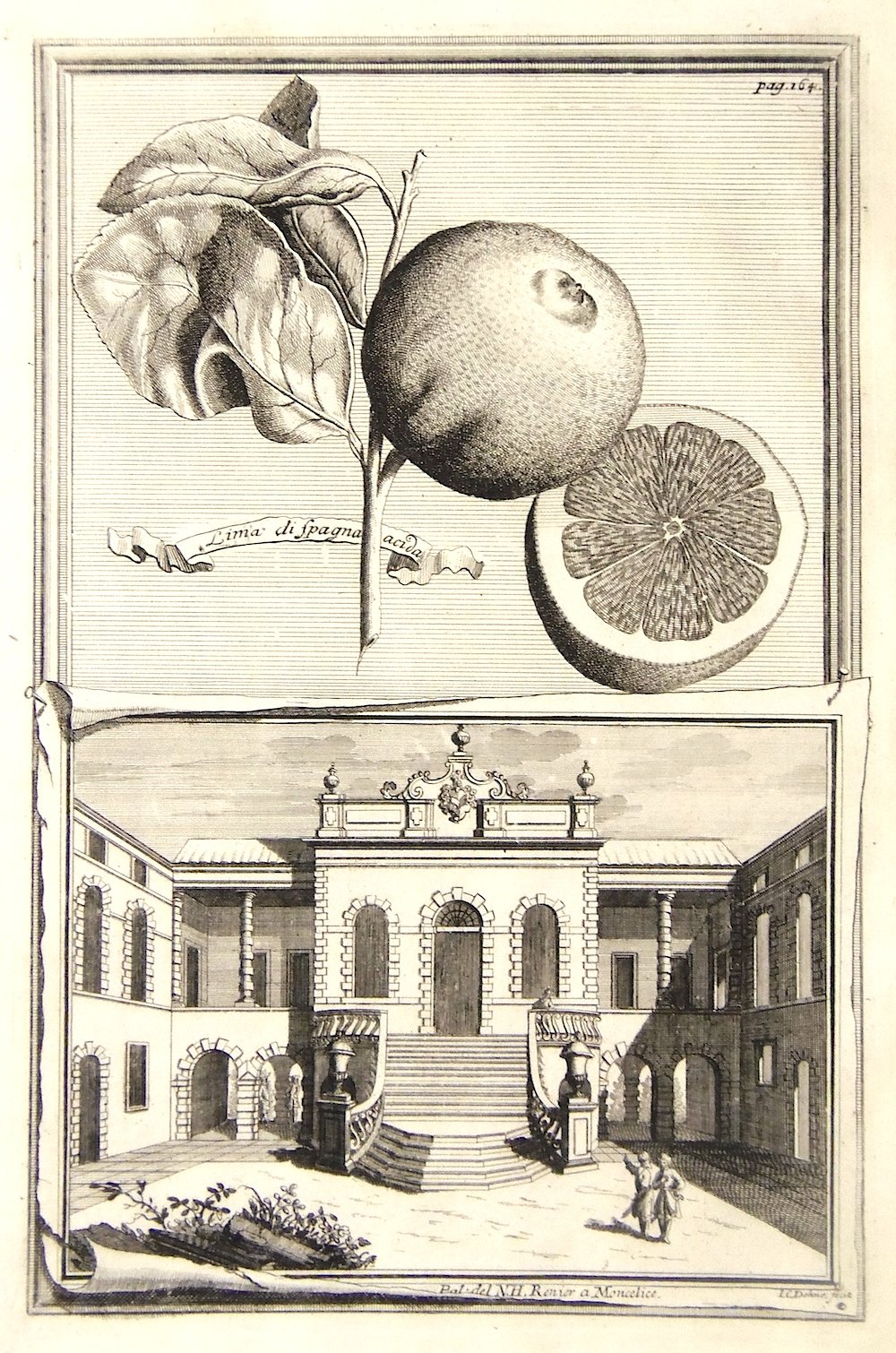 Incisione in rame di I.C. Dehne, mm 324x210. Raffigura il "Lima di Spagna acida". Tratta da "Continuation der Nürnbergischen Hesperidum.". L'opera è illustrata da un apparato iconografico di ricercata bellezza: incisioni raffiguranti agrumi nella parte superiore, mentre in basso vi sono raffigurazioni di palazzi, giardini, labirinti ed altro, che si possono considerare dei capolavori dell'arte botanica, fra cui citiamo: la Malcontenta, villa Pisani, palazzo Foscarini a Stra e numerosissimi altri palazzi che si incontrano lungo il Brenta e nella padovana ed in provincia di Verona con vedute di Quinzano, Parona, Settimo di Pescantina, Chievo; all'inizio le grandi tavole raffiguranti giardini fra cui citiamo Villa Allegri (ora Arvedi) a Cuzzano presso Verona, Palazzo Morosini (Padova), Schoenbrunn, Castello di San Georghen vicino a Bayreuth, Munchausen Schwöbber (vicino a Hameln); alla fine questa edizione è arricchita da grandi tavole ripiegate di piante e frutti esotici con architetture e panorami nei loro habitat. Volckamer (1644 - 1720) intraprendente commerciante di Norimberga con una profonda passione per la botanica, figlio di un medico e botanico dedito allo studio ed alla progettazione di giardini.<BR>Nei primi anni del 1660 visitò una moltitudine di giardini e parchi in Italia, dove nacque un suo speciale interesse per l'universo degli agrumi. Passione che coltivò, attraverso la collezione di piante, dopo il ritorno nella terra natia, costruendo il proprio giardino, dove colto da ispirazione crea numerosi schizzi che poi andranno a comporre la sua opera fondamentale in due libri. <BR>E' nel 1708 che da alle stampe il libro Nürbergisches Hesperides oder gründliche Beschreibung der edlen Citronat, Citronen - und Pomeranzen - Früchte. di evidente derivazione dalle Hesperides di Giovanni Battista Ferrari, opera che celebra gli agrumi (Hesperides, sive, De malorum aureorum cultura).<BR>Volckamer coniuga suggestioni mitologiche e ricerca scientifica in un opera letteraria, di grande fascino, dove i doni della natura si intrecciano a paesaggi e architetture di ville del nord est italiano, luoghi con i quali l'autore intratteneva i suoi contatti d'affari. <BR>Blunt: "delightful views of the gardens and palaces of Germany, Austria and Italy"; <BR>Ottimo esemplare.