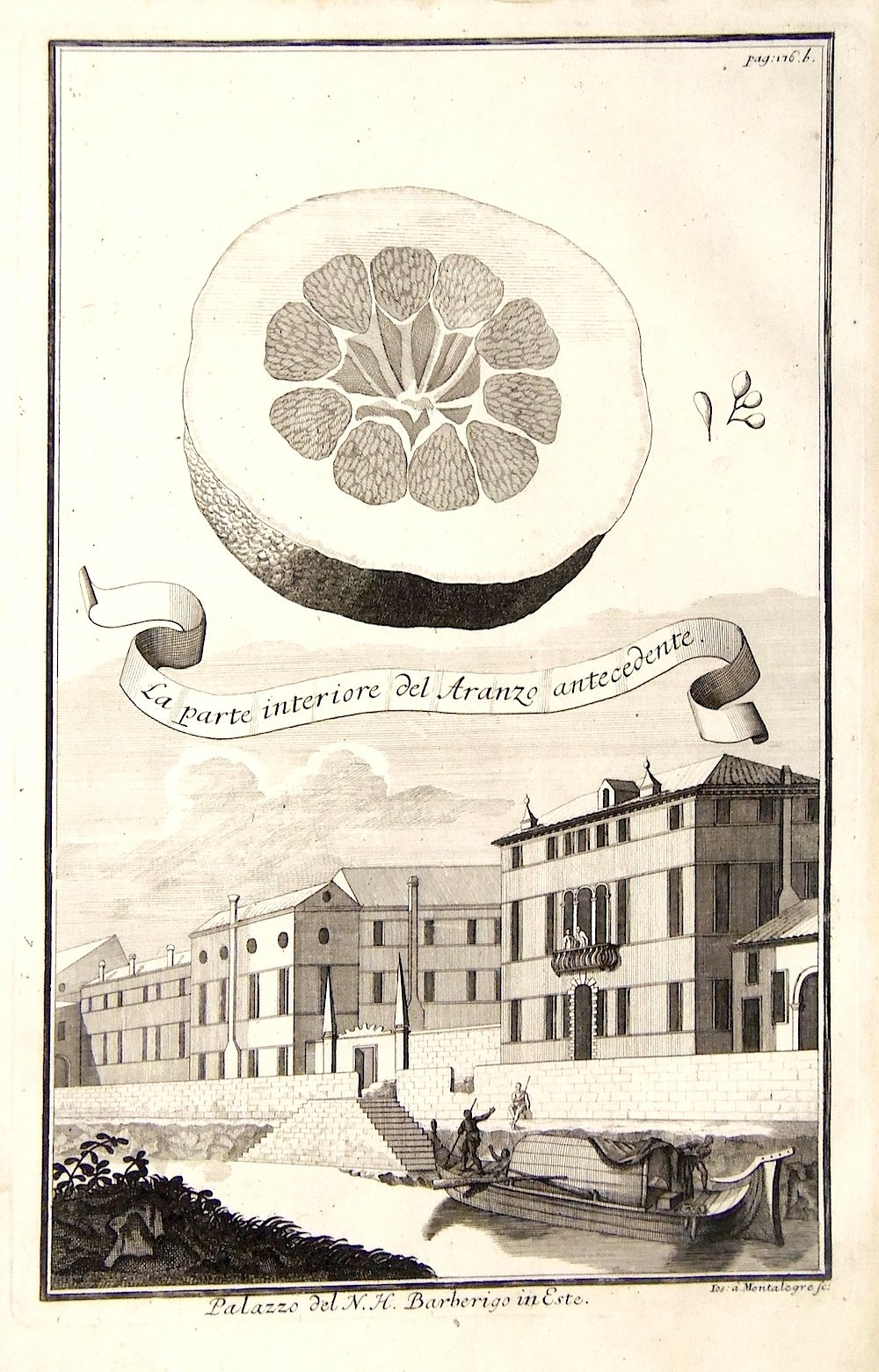 Incisione in rame di Ios a Montalegre. mm 324x210. Raffigura “La parte interiore del Aranzo antecedente”. Tratta da “Continuation der Nürnbergischen Hesperidum.”. L’opera è illustrata da un apparato iconografico di ricercata bellezza: incisioni raffiguranti agrumi nella parte superiore, mentre in basso vi sono raffigurazioni di palazzi, giardini, labirinti ed altro, che si possono considerare dei capolavori dell’arte botanica, fra cui citiamo: la Malcontenta, villa Pisani, palazzo Foscarini a Stra e numerosissimi altri palazzi che si incontrano lungo il Brenta e nella padovana ed in provincia di Verona con vedute di Quinzano, Parona, Settimo di Pescantina, Chievo; all’inizio le grandi tavole raffiguranti giardini fra cui citiamo Villa Allegri (ora Arvedi) a Cuzzano presso Verona, Palazzo Morosini (Padova), Schoenbrunn, Castello di San Georghen vicino a Bayreuth, Munchausen Schwöbber (vicino a Hameln); alla fine questa edizione è arricchita da grandi tavole ripiegate di piante e frutti esotici con architetture e panorami nei loro habitat. Volckamer (1644 - 1720) intraprendente commerciante di Norimberga con una profonda passione per la botanica, figlio di un medico e botanico dedito allo studio ed alla progettazione di giardini. Nei primi anni del 1660 visitò una moltitudine di giardini e parchi in Italia, dove nacque un suo speciale interesse per l’universo degli agrumi. Passione che coltivò, attraverso la collezione di piante, dopo il ritorno nella terra natia, costruendo il proprio giardino, dove colto da ispirazione crea numerosi schizzi che poi andranno a comporre la sua opera fondamentale in due libri. E’ nel 1708 che da alle stampe il libro Nürbergisches Hesperides oder gründliche Beschreibung der edlen Citronat, Citronen - und Pomeranzen - Früchte. di evidente derivazione dalle Hesperides di Giovanni Battista Ferrari, opera che celebra gli agrumi (Hesperides, sive, De malorum aureorum cultura). Volckamer coniuga suggestioni mitologiche e ricerca scientifica in un opera letteraria, di grande fascino, dove i doni della natura si intrecciano a paesaggi e architetture di ville del nord est italiano, luoghi con i quali l'autore intratteneva i suoi contatti d'affari. Blunt: "delightful views of the gardens and palaces of Germany, Austria and Italy"; Ottimo esemplare.