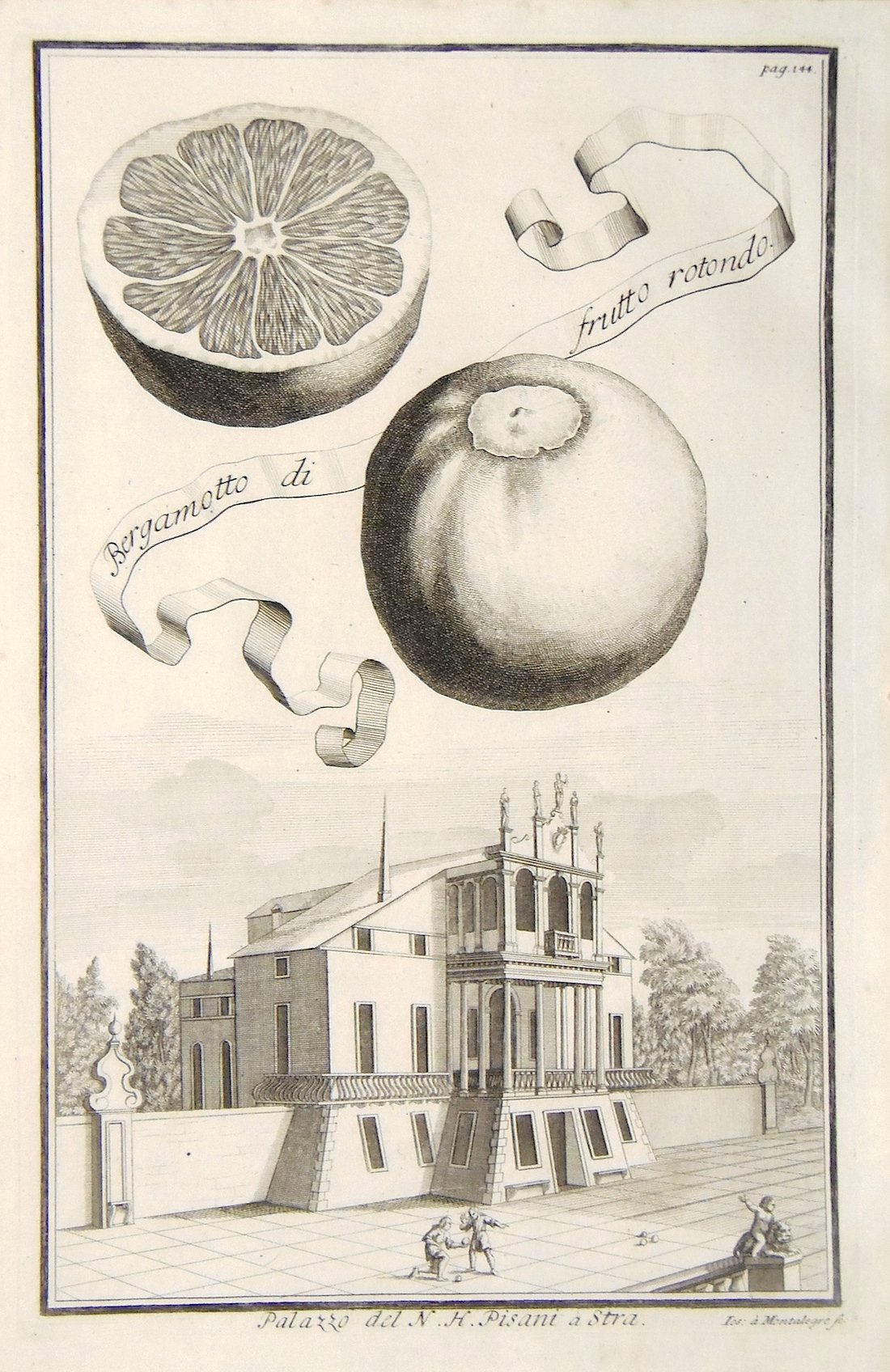 Incisione in rame di Ios. à Montalegre, mm 324x210. Raffigura il "Bergamotto di frutto rotondo". Tratta da "Continuation der Nürnbergischen Hesperidum.". L'opera è illustrata da un apparato iconografico di ricercata bellezza: incisioni raffiguranti agrumi nella parte superiore, mentre in basso vi sono raffigurazioni di palazzi, giardini, labirinti ed altro, che si possono considerare dei capolavori dell'arte botanica, fra cui citiamo: la Malcontenta, villa Pisani, palazzo Foscarini a Stra e numerosissimi altri palazzi che si incontrano lungo il Brenta e nella padovana ed in provincia di Verona con vedute di Quinzano, Parona, Settimo di Pescantina, Chievo; all'inizio le grandi tavole raffiguranti giardini fra cui citiamo Villa Allegri (ora Arvedi) a Cuzzano presso Verona, Palazzo Morosini (Padova), Schoenbrunn, Castello di San Georghen vicino a Bayreuth, Munchausen Schwöbber (vicino a Hameln); alla fine questa edizione è arricchita da grandi tavole ripiegate di piante e frutti esotici con architetture e panorami nei loro habitat. Volckamer (1644 - 1720) intraprendente commerciante di Norimberga con una profonda passione per la botanica, figlio di un medico e botanico dedito allo studio ed alla progettazione di giardini.<BR>Nei primi anni del 1660 visitò una moltitudine di giardini e parchi in Italia, dove nacque un suo speciale interesse per l'universo degli agrumi. Passione che coltivò, attraverso la collezione di piante, dopo il ritorno nella terra natia, costruendo il proprio giardino, dove colto da ispirazione crea numerosi schizzi che poi andranno a comporre la sua opera fondamentale in due libri. <BR>E' nel 1708 che da alle stampe il libro Nürbergisches Hesperides oder gründliche Beschreibung der edlen Citronat, Citronen - und Pomeranzen - Früchte. di evidente derivazione dalle Hesperides di Giovanni Battista Ferrari, opera che celebra gli agrumi (Hesperides, sive, De malorum aureorum cultura).<BR>Volckamer coniuga suggestioni mitologiche e ricerca scientifica in un opera letteraria, di grande fascino, dove i doni della natura si intrecciano a paesaggi e architetture di ville del nord est italiano, luoghi con i quali l'autore intratteneva i suoi contatti d'affari. <BR>Blunt: "delightful views of the gardens and palaces of Germany, Austria and Italy"; <BR>Ottimo esemplare.