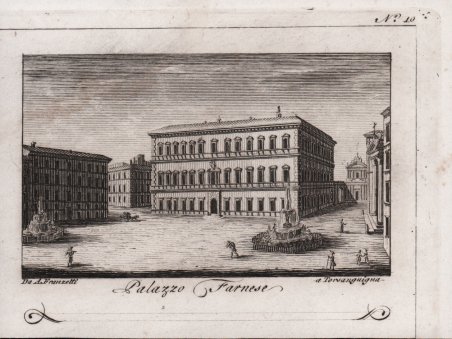 Veduta tratta dalla celebre ' Raccolta di num. 320 Vedute sì antiche, che moderne della città di Roma. …Incise a bulino in N. 80 rami, In Roma Nella Calcografia di Agapito Franzetti a Torsanguigna Col Permesso. ' L’opera si compone di un frontespizio calcografico e di 80 tavole numerate, ognuna composta da quattro vedute. Viene stampata senza data; molti repertori la datano intorno al 1790 circa, forse perché stampata su carta vergata. Una datazione intorno al 1800 ci sembra tuttavia più plausibile. ' Agapito Franzetti, calcografo attivo a Roma con bottega tra via del Corso e Torsanguigna, è noto per le sue piccole incisioni di veduta che servivano spesso come biglietti da visita. Tutte contengono, infatti, una linea in basso, dove si poteva apporre il proprio nome ad inchiostro. Come indicato nel titolo, le vedute raffigurano sia monumenti e antiche rovine che vedute “moderne”, con piazze, chiese e ville. Ciascuna tavola reca, in basso al centro, il nome dell’incisore. Gli artisti coinvolti sono sei: Jean-Jerome Baugean; Antonio Giuseppe Barbazza; Giovanni Battista Cipriani; Francesco Morelli; Antonio Poretta e Domenico Pronti. Molte delle vedute derivano dalla celebre opera di Giuseppe Vasi, ' Delle magnificenze di Roma antica e moderna. Pubblicata in 10 volumi dal 1747 al 1761, l’opera presenta 238 incisioni in rame, ciascuna incisione con testo narrativo che fornisce informazioni storiche e documentarie. ' Acquaforte, in buono stato di conservazione. ' Bibliografia: A. Bertarelli, H. Prior, ' Il biglietto da visita italiano. Cintributo alla storia del costume e dell'incisione nel secolo XVII, Bergamo 1911, p. 162. View of the city printed in Rome by the publisher Agapito Franzetti. Taken from ' Raccolta di num. 320 Vedute sì antiche, che moderne della città di Roma. …Incise a bulino in N. 80 rami, In Roma Nella Calcografia di Agapito Franzetti a Torsanguigna Col Permesso. ' The work consists of an intaglio frontispiece and 80 numbered plates, each consisting of four views. It is printed without date; many repertories date it around 1790, perhaps because it was printed on laid paper. A date around 1800 seems more plausible. Franzetti, a chalcographer working in Rome with a workshop between Via del Corso and Torsanguigna, is known for his small engravings of views that were often used as business cards. They all contain a line at the bottom where one's name could be written in ink. The small views were often printed four to a sheet. As indicated in the title, the views depict both monuments and ancient ruins and "modern" views, with squares, churches and villas. Each table bears, at the bottom center, the name of the engraver. There are six artists involved: Jean-Jerome Baugean; Antonio Giuseppe Barbazza; Giovanni Battista Cipriani; Francesco Morelli; Antonio Poretta and Domenico Pronti. ' The views are made after Giuseppe Vasi’s monumental work ' Delle magnificenze di Roma antica e moderna. Published in 10 volumes from 1747 to 1761, the work features 238 copper engravings, each engraving with a narrative text that provides historical and documentary information. ' Bibliografia: A. Bertarelli, H. Prior, ' Il biglietto da visita italiano. Contributo alla storia del costume e dell'incisione nel secolo XVII, Bergamo 1911, p. 162. Cfr.