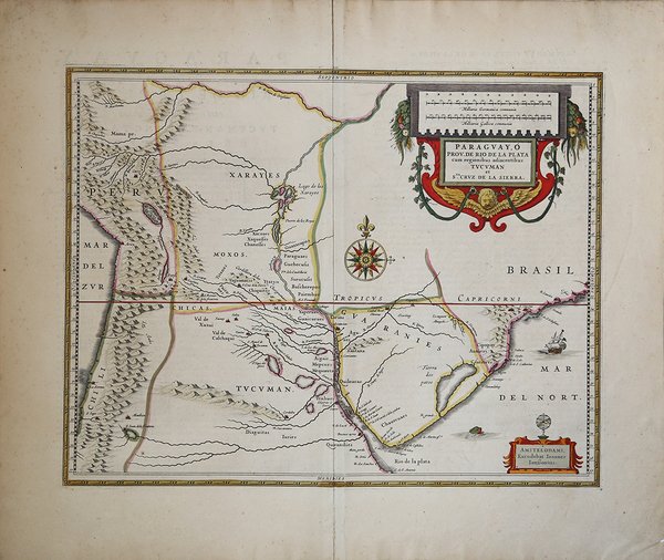 Carta del Paraguay tratta dall'Atlas Novus di Janssonius, pubblicato dagli eredi dopo il 1656. Joannes Janssonius (Arnhem, 1588-1664), son of the Arnhem publisher Jan Janssen, married Elisabeth Hondius, daughter of Jodocus Hondius, in Amsterdam in 1612. After his marriage, he settled down in this town as a bookseller and publisher of cartographic material. In 1618 he established himself in Amsterdam next door to Blaeu’s book shop. He entered into serious competition with Willem Jansz. Blaeu. His activities not only concerned the publication of atlases and books, but also of single maps and an extensive book trade with branches in Frankfurt, Danzig, Stockholm, Copenhagen, Berlin, Koningsbergen, Geneva, and Lyon. In 1631 he began publishing atlases together with Henricus Hondius. In the early 1640s Henricus Hondius left the atlas publishing business completely to Janssonius. Competition with Joan Blaeu, Willem’s son and successor, in atlas production prompted Janssonius to enlarge his Atlas Novus finally into a work of six volumes, into which a sea atlas and an atlas of the Old World were inserted. After the death of Joannes Janssonius, the shop and publishing firm were continued by the heirs under the direction of Johannes van Waesbergen (c. 1616-1681), son-in-law of Joannes Janssonius. The copperplates from Janssonius’s atlases were afterwards sold to Schenk and Valck. Incisione in rame, bella coloritura coeva, in ottime condizioni. This is an early map showing this northern Patagonia territory. Also showing Rio de Janeiro, Sao Paolo, Santa Cruz of Bolivia, Paraguay, Uruguay, Buenos Ayres, Chili and Santo Iago. Joannes Janssonius, figlio dell'editore di Arnhem Jan Janssen, sposò Elisabeth Hondius, figlia di Jodocus Hondius, ad Amsterdam nel 1612. Dopo il suo matrimonio, si stabilì in questa città come libraio ed editore di materiale cartografico. Nel 1618 si stabilì ad Amsterdam accanto alla libreria di Willem Jansz. Blaeu, entrando in una seria competizione. Le sue attività non riguardavano solo la pubblicazione di atlanti e libri, ma anche di mappe singole e un vasto commercio di libri con filiali a Francoforte, Danzica, Stoccolma, Copenaghen, Berlino, Koningsbergen, Ginevra e Lione. Nel 1631 iniziò a pubblicare atlanti insieme a Henricus Hondius. Nei primi anni 1640 Henricus Hondius lasciò l'attività di pubblicazione di atlanti completamente a Janssonius. La concorrenza con Joan Blaeu, figlio e successore di Willem, nella produzione di atlanti spinse Janssonius ad ampliare il suo Atlas Novus finalmente in un'opera di sei volumi, in cui furono inseriti un atlante marino e un atlante del Vecchio Mondo. Dopo la morte di Joannes Janssonius, il negozio e la casa editrice furono continuati dagli eredi sotto la direzione di Johannes van Waesbergen (c. 1616-1681), genero di Joannes Janssonius. Le matrici degli atlanti di Janssonius furono in seguito vendute a Schenk e Valck. Copper engraving, original colours, in good condition. Cfr.