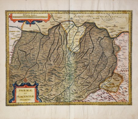 Titolo nel grande cartiglio in basso a sinistra: ' PARMÆ | ET | PLACENTIÆ | DVCATVS. Nel cartiglio in alto a sinistra troviamo la scala miliare. Esemplare nel secondo stato; esiste una prova di stampa della carta che è ancora priva dei cartigli. Tratto dalla rara edizione italiana del ' Theatrum Orbis Terrarum ' stampata ad Anversa da Jean Baptiste Vrients nel 1608 e poi nel 1612. Secondo Peter Meurer (Meurer p. 18-189) la carta è interamente basata sulla carta di Giovanni Antonio Magini (1555-1617) del 1598/99, che secondo Almagià fu completata prima del 1600 (cfr. L’Italia di Giovanni Antoni Magini, 1922, pp. 48-51). Questa carta fu incisa nel 1608, da o per conto di Jan Baptista Vrients, per essere inserita nel ' Theatrum ' di Ortelius, che Vrients continuò a pubblicare come esecutore testamentario di Ortelius. Pertanto, è apparsa solo nelle quattro edizioni finali dell'atlante di Ortelius ed è di conseguenza una delle mappe più scarse tra quelle che compaiono in quell'opera. ' Costituisce l’apice della cartografia decorativa e si colloca tra le mappe più sontuosamente incise. Come noto, gli atlanti di Ortelius stampati da Vrients godevano di una colorazione a mano di altissima qualità e la presente carta ne è un esempio: la colorazione è particolarmente ricca. Johannes Baptista Vrients (1552-1612) fu incisore, editore e cartografo fiammingo. Non si sa molto dei suoi primi anni di vita, ma si presume che sia cresciuto come apprendista tra i cartografi di Anversa, dove la corporazione lo nominò maestro nel 1575. Negli anni 1590 eseguì mappe del mondo per Plancius e Linschoten. Nel 1600 divenne esecutore testamentario di Ortelius e acquisì le tavole del ' Theatrum ' dopo la morte del cartografo. Tra il 1606 e il 1612 pubblicherà altre edizioni dell'atlante di Ortelius. Vrients acquistò anche le tavole dello ' Speculum ' di De Jode intorno al 1600, ma non ripubblicò quell'opera, anche se conservò le tavole di De Jode raffiguranti gli Elettori del Sacro Romano Impero, ristampandole nelle sue edizioni dell'atlante di Ortelius dopo il 1603. Le edizioni del ' Theatrum ' di Vrients non furono pubblicate ad Anversa (la città era caduta durante la guerra dei Paesi Bassi con la Spagna) ma ad Amsterdam. Acquaforte con magnifica coloritura coeva, in ottimo stato di conservazione. ' Bibliografia M. van den Broecke, M. ' Ortelius Atlas Maps: An illustrated Guide ' n. 132.2; Koeman/Meurer: 156; vdKrogtAN: 7250:31); C. Cantadori, Ducato di Parma e Piacenza, pp. 40-51. Title in the large cartouche at lower left: PARMÆ | ET | PLACENTIÆ | DVCATVS. In the upper left cartouche we find the milestone scale. Example in the second state; there is a proof of the map that is still without the cartouches. Taken from the rare Italian edition of Theatrum Orbis Terrarum printed in Antwerp by Jean Baptiste Vrients in 1608 and again in 1612. According to Peter Meurer (Meurer p. 18-189) the map is entirely based on Giovanni Antonio Magini's (1555-1617) map of 1598/99, which according to Almagià was completed before 1600 (see L'Italia di Giovanni Antoni Magini, 1922, pp. 48-51). This map was engraved in 1608, by or for Jan Baptista Vrients, for inclusion in Ortelius' ' Theatrum, which Vrients continued to publish as Ortelius' executor. Therefore, it appeared only in the final four editions of Ortelius' atlas and is consequently one of the scarcest maps among those appearing in that work. It constitutes the pinnacle of decorative cartography and ranks among the most lavishly engraved maps. As is well known, Ortelius' atlases printed by Vrients enjoyed the highest quality hand coloring, and the present map is an example of this: the coloring of the cartouches, compass roses, and ships is particularly rich. Johannes Baptista Vrients (1552-1612) was a Flemish engraver, publisher and cartographer. Not much is known about his early life, but it is assumed that he grew up as an apprentice among the cartographers of Antwerp, where the guild appointed him master in 1575. In the 1590s he executed maps of the world for Plancius and Linschoten. In 1600 he became executor of Ortelius' will and acquired the plates of the ' Theatrum ' after the cartographer's death. Between 1606 and 1612 he published more editions of Ortelius' atlas. Vrients also acquired De Jode's ' Speculum ' plates around 1600. Vrients' editions of the ' Theatrum ' were published not in Antwerp (the city had fallen during the Dutch war with Spain) but in Amsterdam. Etching with magnificent contemporary coloring, in excellent condition. Bibliografia M. van den Broecke, M. ' Ortelius Atlas Maps: An illustrated Guide ' n. 132.2; Koeman/Meurer: 156; vdKrogtAN: 7250:31); C. Cantadori, Ducato di Parma e Piacenza, pp. 40-51. Cfr.