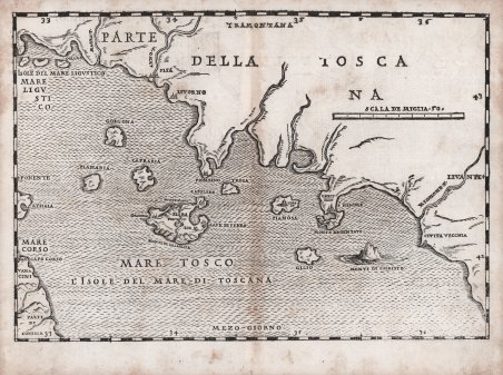 Carta geografica tratta dal ' Descrittione di tutta Italia ' di Leandro Alberti, stampato per la prima volta nel 1561. L’opera offre numerose notizie di carattere geografico-storico-etnologico ed è arricchita dalle carte geografiche per la prima volta nel 1568. Si tratta della più importante guida di viaggio in Italia della prima età moderna, contenente ampie informazioni su corografia, storia, etnografia e cultura artistica. La seconda parte contiene la ' Descrittione di tutte le isole ' e l'aggiunta della descrizione di Venezia ed è illustrata da 7 carte geografiche intagliate in legno. Le due parti furono pubblicate insieme o separatamente. Leandro Alberti (1479-1552) era uno studioso domenicano di Bologna, conoscitore di Achille Bocchi e Andrea Alciato. Scrisse numerose storie, servendo l'Inquisizione come censore e poi inquisitore ufficiale dal 1550 alla sua morte. Fu noto soprattutto per la sua attività contro la stregoneria. La ' Descrittione ' riassume i suoi lunghi viaggi (1525-1528) attraverso la penisola italiana con il generale dell'Ordine domenicano Francesco Silvestro da Ferrara per visitare i conventi domenicani e fu poi usata come modello dai cartografi olandesi, come Abraham Ortelius. L'opera comprende capitoli su 18 delle 19 regioni d'Italia, fornendo informazioni su paesaggio, costumi, personaggi importanti, antichità e monumenti, specialmente fortificazioni e chiese. Una lunga introduzione dettaglia le risorse naturali dell'Italia, la sua favorevole posizione geografica e il clima, così come la topografia e i confini, le origini del suo nome e i primi insediamenti tra Lazio e Toscana. Ogni capitolo si concentra su una regione diversa e comprende excursus etimologici e storici, con riferimenti a figure eroiche e rappresentanti del mondo della cultura. I capitoli più significativi ed estesi riguardano le città di Roma, la sua fondazione e il suo governo, i luoghi di rilevanza storica e i resti archeologici; e Firenze, notevole per la sua storia e patria di gloriosi sovrani, studiosi e artisti. Il resoconto delle province meridionali d'Italia costituisce una novità in quanto l'Alberti fu uno dei primi viaggiatori a descrivere le zone di Terra di Lavoro e della Puglia, registrando il nome dei luoghi nei dialetti, la natura e i luoghi di pellegrinaggio come il Santuario dell'Arcangelo Michele nella grotta sul Monte Gargano. L'opera si ispira principalmente all'Italia illustrata ' di Flavio Biondo, ma Alberti non si attiene completamente al suo schema, raccogliendo informazioni di prima mano e utilizzando nuove fonti come storie locali e mappe, oltre ad altri autori della prima età moderna. Xilografia, impressa su carta vergata coeva, ottima impressione con margini, perfette condizioni. Map taken from the ' Descrittione di tutta Italia ' by Leandro Alberti, printed for the first time in 1561. The work offers numerous news of geographic-historical-ethnological character and is enriched by maps for the first time in 1568. The book is the most important early modern travel guide to Italy, containing extensive information on chorography, history, ethnography and artistic culture, published without part 2 containing the ' Descrittione di tutte le isole ' and the added description of Venice. The two parts were issued together or separately. Leandro Alberti (1479-1552) was a Dominican scholar from Bologna, acquainted with Achille Bocchi and Andrea Alciato. He wrote numerous histories, serving the Inquisition as censor and then official inquisitor from 1550 to his death. He was mostly known for his anti-witchcraft activity. The Descrittione summarised his long travels (1525-1528) across the length of the Italian peninsula with the Dominican Order s General Francesco Silvestro da Ferrara to visit Dominican convents and was later used as a model by the Dutch cartographers, such as Abraham Ortelius. The account of the Southern provinces of Italy constitute a novelty since Alberti was one the first travellers who described the areas of Terra di Lavoro and Puglia, recording places name in dialects, nature and pilgrimage sites such as the Sanctuary of the Archangel Michael in the cave on Mount Gargano. The work was mainly inspired by Flavio Biondo s Italia illustrata but Alberti did not adhere to its pattern completely, collecting first-hand information and using new sources such as local histories and maps, as well as other early modern authors. Woodcut, printed on contemporary laid paper, very good condition. Cfr.