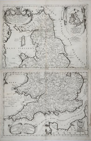 Bella e decorativa carta geografica dell'Inghilterra in due fogli. Arricchita da due cartigli, uno con la dedica al Badoer. Opera tratta dall’Isolario dell’Atlante Veneto del P. Coronelli, In Venetia MDCXCVI. Coronelli visse un periodo di straordinaria fecondità editoriale a partire dal 1689, quando ebbe la cattedra di geografia presso l'Università alle Procuratie, con la pubblicazione, nel 1690, del primo volume dell'Atlante Veneto. In effetti sotto il nome di Atlante Veneto va tutta la raccolta di tredici opere composte nell'arco del decennio successivo, dall'Isolario allo Specchio del mare. L'Isolario mira, con una barocca e minuziosa ricerca del dettaglio, alla celebrazione dei possedimenti della Serenissima. Monumentale raccolta di carte e vedute di isole, rappresenta l'ultimo degli “isolari” concepiti, che, tra la fine del XVII e l'inizio del XVIII secolo, vennero progressivamente soppiantati dagli atlanti di moderna concezione, opere a stampa caratterizzate da crescente precisione scientifica e da sempre minore pregio artistico. Sulla scia delle nuove conquiste coloniali le rappresentazioni cartografiche vennero ad assumere un carattere sempre più tecnico, fino ad allora piuttosto arbitrario. In buone condizioni. Attractive two sheet map of Engalnd. England is divided within the boundaries of the seven ancient Anglo-Saxon kingdoms, and some alternative place names are given (marked with an asterisk) based on Ptolemaic or other classical sources such as Tacitus and Bede. An inset of the British Isles is included in the upper sheet. The map is taken from Isolario dell’Atlante Veneto del P. Coronelli, In Venetia MDCXCVI. Coronelli lived a period of extraordinary editorial fecundity starting from 1689, when he had the chair of geography at the University at the Procuratie, with the publication, in 1690, of the first volume of the Atlante Veneto. Under the name of Atlante Veneto goes the entire collection of thirteen works composed over the next decade, from the Isolario to the Specchio del mare. The Isolario aims, with a baroque and meticulous search for detail, to celebrate the possessions of the Serenissima. Monumental collection of maps and views of islands, represents the last of the "isolarios" conceived, which, between the end of the seventeenth and the beginning of the eighteenth century, were gradually supplanted by modern atlases, printed works characterized by increasing scientific precision and less and less artistic value. In the wake of the new colonial conquests, cartographic representations came to assume an increasingly technical character, until then rather arbitrary. The remarkable Vincenzo Coronelli (1650-1718), encyclopaedist, geographer, inventor and Doctor of Theology, was a citizen of the Republic of Venice. He was also one of the most prominent mapmakers and publishers in the Europe of his day. The map is both include in Corso Geografico Universale and Isolario by Coronelli. Good condition. Cfr.
