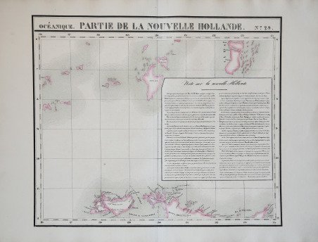 Carta apparsa nella sesta parte, "Océanique", dell'Atlas universel de géographie physique, politique, statistique et minéralogique di Vandermaelen. L'atlante fu prodotto in un'unica edizione nel 1827; furono venduti solo 810 esemplari completi. ' Questa grande opera, che comprende circa 378 mappe uniche e che fu compilata nell'arco di tre anni, fu il primo atlante litografico e il primo a rappresentare il mondo con la stessa proiezione e in una scala uniforme. Philippe Marie Guillaume Vandermaelen è stato un cartografo fiammingo attivo a Bruxelles nella prima parte del XIX secolo. A Vandermaelen si deve uno dei più notevoli sviluppi dell'impresa privata nella cartografia, ovvero il suo straordinario Atlas Universel de Geographie in sei volumi. Vandermaelen, nato a Bruxelles il 23 dicembre 1795, viene considerato come il più grande cartografo belga dopo Mercatore e Ortelius. Figlio di un medico che era diventato un ricco produttore di sapone, muovendosi in un ambiente commerciale e da autodidatta, divenne un commerciante di prodotti chimici e farmaceutici. Fanatico di geografia, la sua carriera subisce una svolta definitiva quando, nel 1825, inizia a pubblicare un rivoluzionario Atlas universel che lo consacra come cartografo. Primo atlante al mondo a rappresentare la Terra su una scala unica ed eccezionalmente grande, l'Atlas universel offriva la rappresentazione più ampia, completa e precisa mai realizzata. I suoi contemporanei lo capirono, come la Chiesa cattolica romana, che era in una fase di espansione. Negli anni Trenta del XIX secolo, Roma sosteneva che questo atlante era assolutamente il miglior atlante disponibile, prezioso strumento della sua politica missionaria nell'Oceano Pacifico e nelle isole meridionali. Bibliografia Marguerite Silvestre, Philippe Vandermaelen, Mercator de la jeune Belgique, 2016. Map appeared in the sixth part, 'Océanique,' of Vandermaelen's Atlas universel de géographie physique, politique, statistique et minéralogique. The atlas was produced in one edition in 1827; only 810 complete sets were sold. ' This great work, featuring some 378 unique maps and compiled over three years, was the first lithograph atlas, and the first to render the world on the same projection and at a uniform scale. Philippe Marie Guillaume Vandermaelen (December 23, 1795 - May 29, 1869) was a Flemish cartographer active in Brussels during the first part of the 19th century. Vandermaelen is created with "one of the most remarkable developments of private enterprise in cartography," namely his remarkable six volume Atlas Universel de Geographie. No one could have foreseen that Philippe Vandermaelen, born in Brussels on 23 December 1795, would become the greatest Belgian cartographer since Mercator and Ortelius. Son of a doctor who had become a wealthy soap maker, moving in a business environment and self-taught, he became a dealer of chemical and pharmaceutical products. As a geography fanatic, there was a definitive shift in his career when, in 1825, he began to publish a revolutionary Atlas universel which established him as a cartographer. As the first atlas in the world to represent the Earth on a single and exceptionally large scale, the Atlas universel offered the widest, most complete and most precise representation ever achieved. His contemporaries understood this, such as the Roman Catholic Church, which was in a phase of expansion. In the 1830s, Rome claimed that this atlas was “the best atlas available” and was the instrument of its missionary policy in the Pacific Ocean and the southern islands. Litograph, with original outline colour, very good condition. Bibliografia Marguerite Silvestre, Philippe Vandermaelen, Mercator de la jeune Belgique, 2016. Cfr.